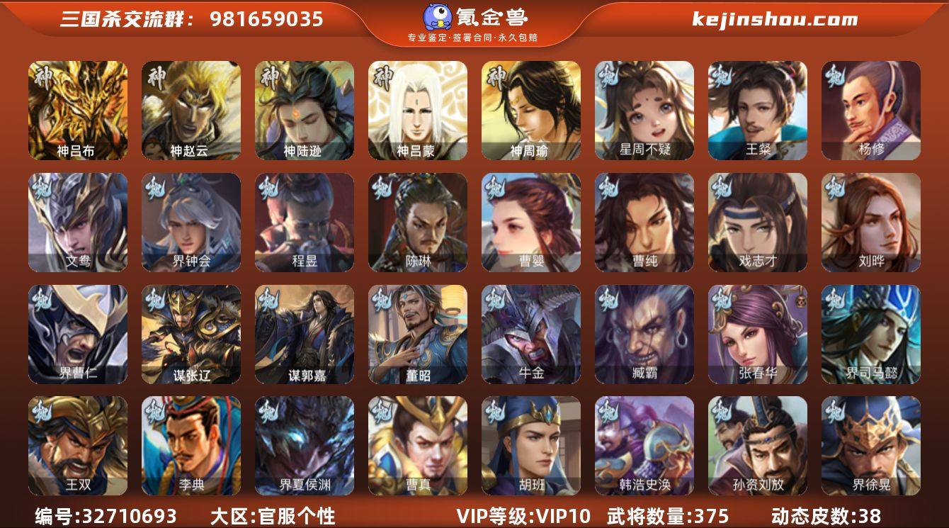 VIP等级: VIP10 官阶: 大将军 武将数量: 375 动态皮肤数量: 38 神将: 神陆逊,神吕布,神赵云,神吕蒙,神周瑜 魏国武将: 刘晔,戏志才,曹纯,曹婴,陈琳,程昱,界钟会,文鸯,杨修,王粲,SP蔡文姬,SP关羽,SP姜维,卞夫人,蔡贞姬,曹昂,曹冲,曹叡,曹嵩,张恭,鲁芝,界满宠,曹休,界曹植,满宠,王基,钟繇,蒯越蒯良,杜畿,崔琰,界曹丕,界荀彧,朱灵,吕虔,界王异,界许褚,华歆,陈群,界邓艾,界典韦,谋甄姬,袁涣,乐进,辛宪英,郭淮,郭皇后,司马朗,谋于禁,界曹操,星周不疑,界张辽,谋徐晃,钟会,文聘,界夏侯惇,诸葛诞,杨阜,界徐晃,界曹仁,孙资刘放,韩浩史涣,胡班,曹真,界夏侯渊,谋荀彧,李典,王双,界司马懿,张春华,臧霸,牛金,董昭,谋郭嘉,谋张辽 蜀国武将: 董允,关索,花鬘,谯周,沙摩柯,马云騄,谋黄月英,界魏延,杨仪,吕凯,界关羽,界诸葛亮,费祎,严颜,界张嶷,张松,彭羕,界刘备,谋法正,谋姜维,刘封,糜竺,李遗,谋庞统,王甫赵累,吴懿,黄皓,界周仓,谋祝融,马忠,界法正,界赵云,张翼,关银屏,SP孙尚香,SP徐庶,周仓,简雍,界关兴张苞,界张飞,赵统赵广,陈到,界马岱,关平,界庞统,诸葛果,谋张飞,霍峻,廖化,关兴张苞,秦宓,吴苋,夏侯氏,界马超,夏侯霸,李严,马良,傅肜,蒋琬费祎,刘谌,甘夫人,势陈到,势陈祗 吴国武将: 界徐盛,界...