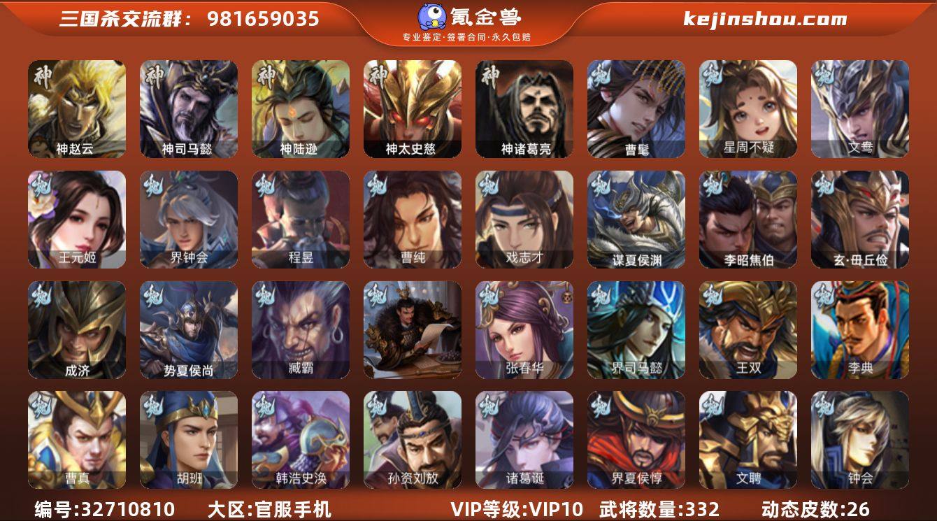 【14789798】官阶:大将军;VIP等级:VIP10;史诗武将数量:36;动态皮肤数量:26;武将总数:332;史诗宝珠数量:1;将魂数量:2944;神将:5;魏国史诗武将:24;蜀国史诗武将:9;吴国史诗武将:7;群史诗武将:10