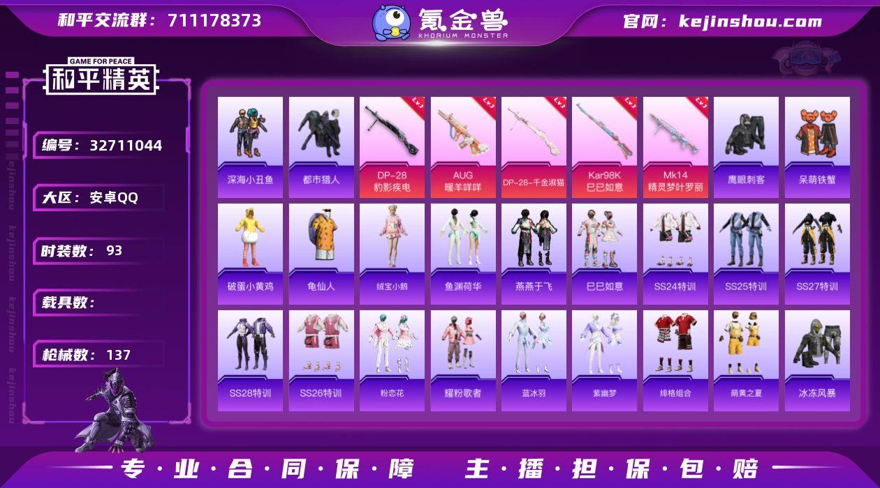 安卓 手Q-1粉装-7特效枪-0载具-2粉色飞行器-39443热力值-1王牌印记-93套装-137枪皮 【热门品类】:套装-都市猎人,套装-深海小丑鱼,套装-龟仙人 【粉色套装】:角色-异瞳寒姬 【粉色枪皮等级】:AUG-暖羊咩咩(五级),UMP45-萌骑冒险(五级),Kar98K-巳巳如意(五级),Mk14-精灵梦叶罗丽(七级),Mk14-福马献瑞(五级),DP-28-千金淑猫(一级),DP-28-豹影疾电(五级) 【粉色枪皮】:AUG-暖羊咩咩,UMP45-萌骑冒险,Kar98K-巳巳如意,Mk14-精灵梦叶罗丽,Mk14-福马献瑞,DP-28-千金淑猫,DP-28-豹影疾电 【粉色飞行器】:炫彩糖果飞行器,极意拳锋飞行器 【粉色降落伞】:暗夜玫瑰降落伞,精灵梦叶罗丽降落伞,圣域龙灵降落伞,幻彩电音降落伞,炫彩糖果降落伞 【稀有套装】:套装-龟仙人,套装-绒宝小鹅,套装-巳巳如意,套装-燕燕于飞,套装-鱼渊荷华,套装-粉恋花,套装-紫幽梦,套装-蓝冰羽,套装-极速光影,角色-绯色魅影,套装-雨过天青,套装-红釉青花 【稀有枪皮】:AKM-夜灯,AKM-影袭,AKM-生命誓言,AKM-萌趣颜团子,AKM-虎虎生威,AKM-龙的传人,M16A4-蓝色火焰,SCAR-L-红色方程式,M416-糯团青竹,M416-蓝色火焰,GROZA-彩虹符号,GROZA-影袭,AUG-天降萌叽,AUG-耀粉...