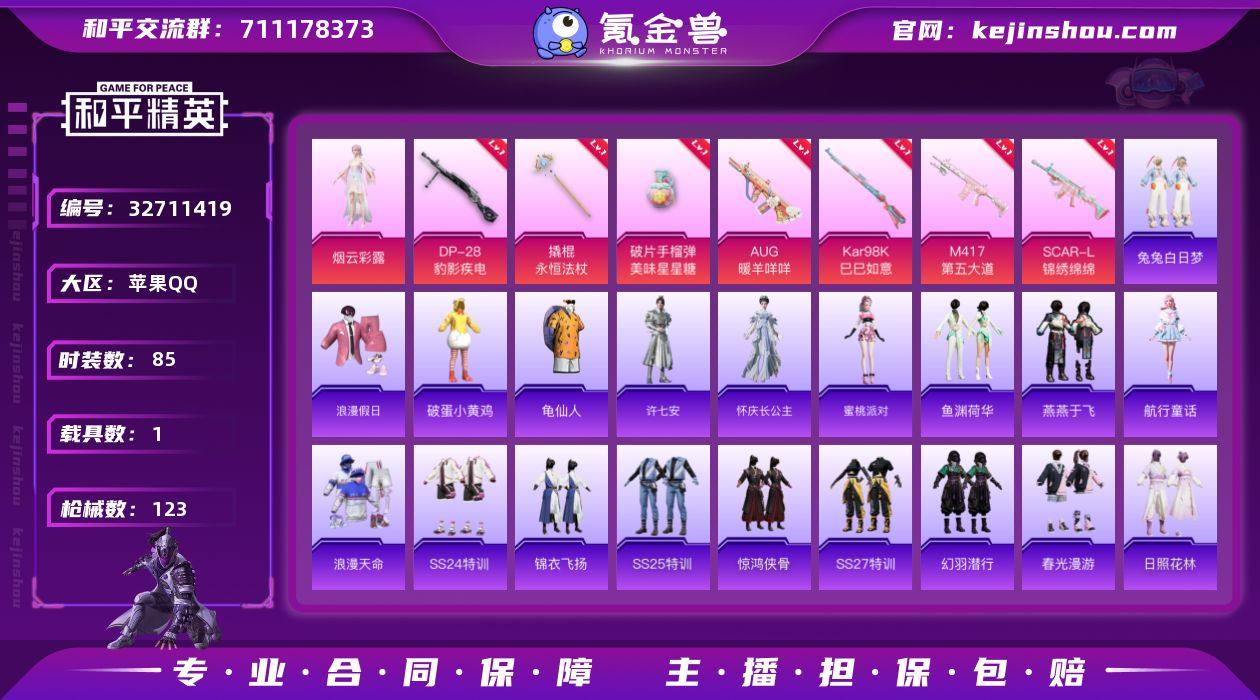 苹果 手Q-3粉装-10特效枪-1载具-1粉色飞行器-38104热力值-5王牌印记-85套装-123枪皮 【热门品类】:套装-浪漫天命,套装-龟仙人 【粉色套装】:角色-烟云彩露,角色-月中灵,角色-虹云熊熊 【粉色枪皮等级】:SCAR-L-锦绣绵绵(五级),AUG-暖羊咩咩(五级),UMP45-萌骑冒险(五级),Kar98K-巳巳如意(五级),Mk14-福马献瑞(五级),M417-第五大道(三级),AA12-G-萌骑幻想(五级),DP-28-豹影疾电(一级),撬棍-永恒法杖(七级),破片手榴弹-美味星星糖(七级) 【粉色载具】:法拉利LaFerrari(赛车红) 【粉色枪皮】:SCAR-L-锦绣绵绵,AUG-暖羊咩咩,UMP45-萌骑冒险,Kar98K-巳巳如意,Mk14-福马献瑞,M417-第五大道,AA12-G-萌骑幻想,DP-28-豹影疾电,撬棍-永恒法杖,破片手榴弹-美味星星糖 【粉色飞行器】:香车宝马飞行器 【粉色降落伞】:闲梦青缨降落伞,莲影清波降落伞,临安公主降落伞,冷漠罗丽降落伞,绯穹魔姬降落伞,霁蓝缠春降落伞,虹云熊熊降落伞 【稀有套装】:套装-龟仙人,套装-航行童话,套装-雪国风尚,套装-马上来财,角色-许七安,角色-怀庆长公主,套装-燕燕于飞,套装-鱼渊荷华,角色-蜜桃派对,套装-紫幽梦,套装-蓝冰羽,套装-星渊小夜曲,套装-云朵鹅,套...
