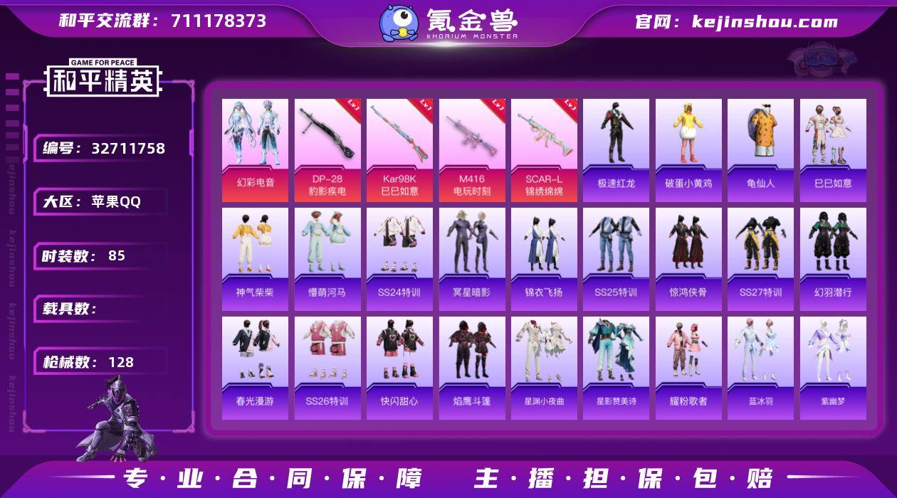 苹果 手Q-1粉装-6特效枪-0载具-2粉色飞行器-35866热力值-3王牌印记-85套装-128枪皮 【热门品类】:套装-龟仙人 【粉色套装】:粉装-幻彩电音 【粉色枪皮等级】:SCAR-L-锦绣绵绵(五级),M416-电玩时刻(五级),蜜獾-异瞳寒姬(六级),AKS-74U-森灵之息(五级),Kar98K-巳巳如意(五级),DP-28-豹影疾电(五级) 【粉色枪皮】:SCAR-L-锦绣绵绵,M416-电玩时刻,蜜獾-异瞳寒姬,AKS-74U-森灵之息,Kar98K-巳巳如意,DP-28-豹影疾电 【粉色飞行器】:极意拳锋飞行器 【粉色降落伞】:星之彼岸降落伞,怪笑疯兔降落伞,暗夜玫瑰降落伞,猪猪侠降落伞,星穹咏叹调降落伞,异瞳寒姬降落伞,炫彩糖果降落伞 【稀有套装】:套装-龟仙人,套装-巳巳如意,套装-炫彩糖果,套装-紫幽梦,套装-蓝冰羽,套装-星影赞美诗,套装-星渊小夜曲,套装-画境星梦,套装-琴音绮想 【稀有枪皮】:AKM-破晓战魂,AKM-龙的传人,SCAR-L-夜灯,SCAR-L-红色方程式,SCAR-L-黄金龙骨,M416-糯团青竹,M416-红色方程式,M416-绯红前夜,M416-蓝色火焰,GROZA-懵萌河马,AUG-耀粉歌者,QBZ-未来歌姬,M762-天降萌叽,G36C-懵萌河马,AC-VAL-快闪甜心,蜜獾-天降萌叽,ACE32-画境星梦,UZI-啾咪啾咪,UMP45-夜灯,V...