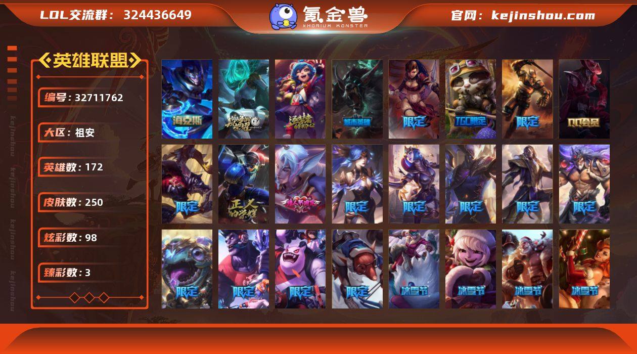 黄金段位-172英雄-250皮肤-98炫彩-0终极-3神话-33限定-20传说-61史诗 【神话皮肤】:十周年纪念安妮,源代码乐芙兰 【海克斯皮肤】:海克斯科技嘉文四世 【臻彩皮肤】:霸天巨兽雪崩墨菲特,魔女阿卡丽虚荣,净雪之月莫甘娜冬虹 【情人节限定】:甜心之翎洛 【冰雪限定】:圣诞精灵崔丝塔娜,圣诞狂欢努努和威朗普,圣诞糖果棒厄运小姐,阿木木“主人不要我了”,胡桃夹子萨科,邪恶圣诞老人维迦,喜庆之树茂凯,雪默丁格,雪装奈德丽,圣诞老人古拉加斯,圣诞驯鹿克格莫,魄罗骑士瑟庄妮,圣诞老人布隆 【限定皮肤】:暗杀星蒙多,暗杀星努努和威朗普,SSW图奇,胜利女神奥莉安娜,胜利之剑亚托克斯,胜利枪神卢锡安,胜利之王泰达米尔,胜利巨口克格莫,胜利女神娑娜,胜利女神菲奥娜,南瓜头费德提克,鬼影森森茂凯,密林猎手提莫,女猎手希维尔,暗影沃里克,都铎王朝图奇,红桃杰克崔斯特,防暴天使凯尔,警用试作体K9内瑟斯 【传说皮肤】:地狱之门卫士加里奥,大天使长米迦勒凯尔,战场女武神凯尔,恶魔男爵瑞兹,提莫约德尔人的一大步,合金巨兽努努和威朗普,女皇艾希,恶魔之刃泰达米尔,魔女伊芙琳,绅士科加斯,黯晶凤凰艾尼维亚,红色男爵库奇,女警狙击凯特琳,神...