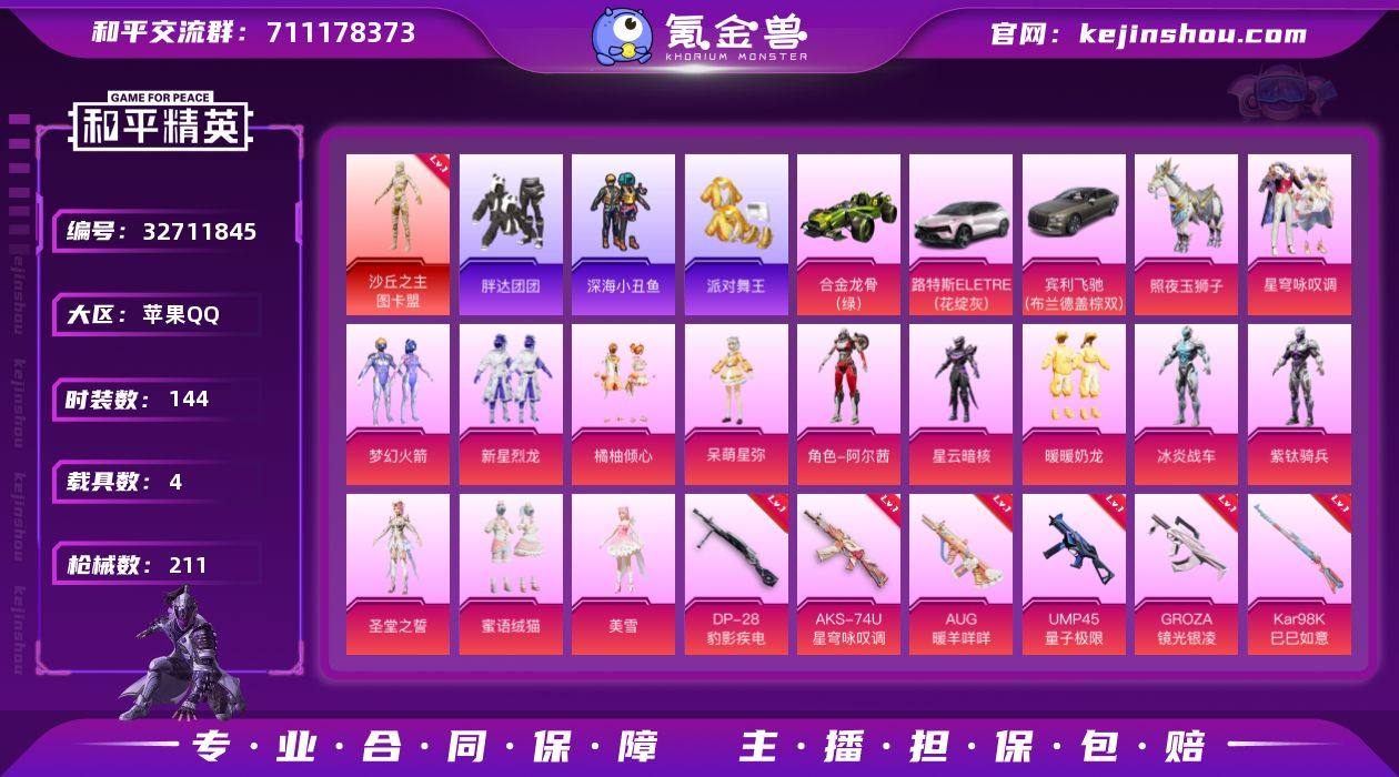 苹果 手Q-无敌战神框-1神装-16粉装-14特效枪-4载具-9粉色飞行器-77773热力值-12王牌印记-144套装-211枪皮 【红色神装等级】:沙丘之主-图卡盟(四级) 【红色角色神装】:沙丘之主-图卡盟 【热门品类】:粉装-梦幻火箭,套装-浪漫天命,套装-派对舞王,套装-深海小丑鱼,套装-小丑鱼,套装-胖达团团,角色-忠猛周仓,角色-忠真马岱,角色-忠义严颜,套装-六号树人,套装-龟仙人,套装-暗影哥特,大砍刀-青龙偃月刀,撬棍-龙胆亮银枪 【粉色套装】:粉装-梦幻火箭,粉装-新星烈龙,粉装-橘柚倾心,角色-呆萌星弥,角色-阿尔茜,角色-星云暗核,粉装-暖暖奶龙,角色-冰炎战车,角色-紫钛骑兵,角色-圣堂之誓,粉装-蜜语绒猫,角色-美雪,角色-月影灵韵,粉装-星穹咏叹调,角色-蜜语粉晶,角色-极地冰晶 【粉色枪皮等级】:AKM-绿萝繁花(五级),SCAR-L-锦绣绵绵(五级),M416-心之恋语(六级),M416-墨龙九天(三级),GROZA-镜光银凌(五级),AUG-暖羊咩咩(五级),ACE32-萌骑漫游(二级),UMP45-量子极限(五级),AKS-74U-星穹咏叹调(四级),P90-沙丘之主(三级),Kar98K-巳巳如意(五级),M249-猪猪侠(二级),DP-28-豹影疾电(五级) 【粉色载具】:路特斯ELETRE(花绽灰),宾利飞驰(布罗...