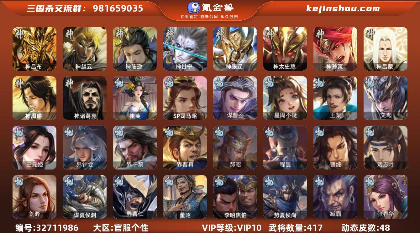 【4548】官阶:大将军;VIP等级:VIP10;史诗武将数量:57;动态皮肤数量:48;武将总数:417;史诗宝珠数量:15;将魂数量:6643;神将:8;魏国史诗武将:33;蜀国史诗武将:11;吴国史诗武将:10;群史诗武将:16 神吕布,神赵云,神陆逊,神甘宁,神张辽,神太史慈,神孙策,神诸葛亮,SP司马昭,星周不疑,王粲,王元姬,界钟会,界于禁,界曹真,郝昭,曹纯,戏志才,刘晔,谋曹丕,崔芙,程昱,关索,马云騄,谋赵云,谋马超,诸葛瞻,张星彩,沙摩柯,谯周,花鬘,董允,鲍三娘,吴景,孙皓,骆统,留赞,界朱然,界徐盛,界步练师,贺齐,文鸯,十常侍,左慈,郑玄,张让,星甘宁,苏飞,麹义,祢衡,沮授,界左慈,界李儒,公孙康,杜预,许攸,谋吕布,兀突骨,神吕蒙,神周瑜,势夏侯尚,SP关羽,SP曹仁,SP蔡文姬,乐进,曹昂,诸葛诞,朱灵,文聘,SP姜维,张春华,钟会,曹冲,郭淮,满宠,界王异,界曹操,界司马懿,界夏侯惇,界张辽,界许褚,界郭嘉,李典,曹真,韩浩史涣,陈群,曹叡,曹休,钟繇,司马朗,王基,李通,郭皇后,孙资刘放,辛宪英,界甄姬,吕虔,鲁芝,蒯越蒯良,界典韦,界荀彧,界徐晃,杜畿,界曹丕,界邓艾,张恭,贾逵,界曹植,界曹彰,界满宠,界郭淮,卞夫人,界陈群,袁涣,王双,崔琰,阮慧,曹嵩,谋徐晃,谋于禁,牵招,胡班,李昭焦伯,司马孚,谋夏侯渊,界夏侯渊,界曹...