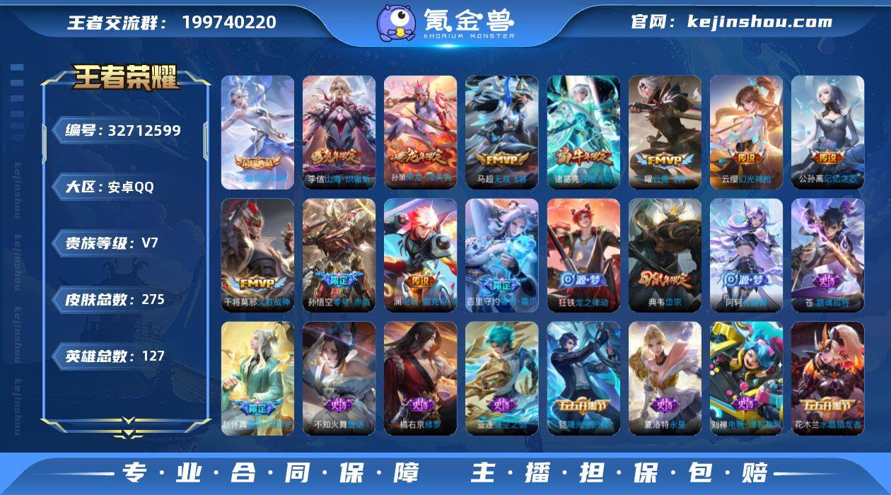 说 127英雄 275皮肤 可修改实名 男号 澜省标 【英雄全皮】澜全皮,苍全皮,赵怀真全皮 【稀有英雄】敖隐(小龙人),大司命,嬴政(始皇帝),韩信(韩跳跳),夏洛特(夏师傅),艾琳,橘右京(橘子),娜可露露(鸟人),不知火舞,赵云,金蝉(唐僧),戈娅 【荣耀水晶】最初的交响(伽罗典藏) 【传说皮】乘龙·淬吴钩(孙策年限),幻光神枪,神树通天,山海·炽霜斩(李信年限),零号·赤焰,末日机甲-孙尚香(绿蚂蚱),久胜战神,云鹰飞将(小将军),无双飞将,记忆之芯(机甲兔),电玩·雷克斯,澜逐花归海 【珍宝阁皮】万物之道,蔷薇恋人,玩趣恶龙 【赛季/战令皮】噬灭天穹(s37),古海寻踪(s33),星界游侠,海盐诗旅(s30),擒涛扼浪(s31),探海日志(s32),流音漫舞,地狱燃心,剑破天穹(s35),天穹祈灯(s34),天穹之誓(s36),蔡文姬夏日便利店,暖冬·兔眠,原初探秘者(s21),万华元夜(s22),演武夺筹(s23),驱傩正仪(s24),千军破阵(s25),狮舞东方,银河之约,潮玩骑士王,火炮绅士,沙漠行僧(s26),幻夜卜梦,吟游魔法,夜都怪侠,金庭之子(s27),大漠名商(s28),云中旅人(s29) 【史诗皮】破空之剑,星界战将,百相守梦-百里守约,狼魂孤将,器灵·浮梦炉,化蝶舞,线条小狗-周瑜,九幽镇关,巫礼祀神,万灵启世,光弋星穹,龙之律动,雪豹·霜爪,百相守梦-黄忠,...