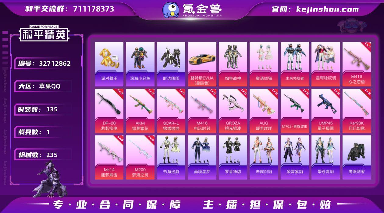 【kyhp1273】苹果 手Q-5粉装-17特效枪-1载具-3粉色飞行器-68461热力值-12王牌印记-135套装-235枪皮 【热门品类】:套装-浪漫天命,套装-派对舞王,套装-深海小丑鱼,套装-胖达团团,套装-龟仙人,角色-Mark.06 【粉色套装】:粉装-绚金战神,粉装-蜜语绒猫,粉装-未来领航者,粉装-星穹咏叹调,角色-罪夜之冕 【粉色枪皮等级】:AKM-绿萝繁花(五级),SCAR-L-锦绣绵绵(五级),M416-心之恋语(七级),M416-电玩时刻(五级),GROZA-镜光银凌(五级),AUG-暖羊咩咩(五级),AUG-罪夜之冕(五级),M762-青锋波束(五级),ACE32-萌骑漫游(四级),UMP45-量子极限(五级),AKS-74U-森灵之息(五级),Kar98K-巳巳如意(五级),Mk14-甜梦熊击(五级),Mk14-福马献瑞(五级),M200-梦海之灵(三级),DP-28-豹影疾电(五级),M338-回旋牧梦使(四级) 【粉色载具】:路特斯EVIJA(星际黄) 【粉色枪皮】:AKM-绿萝繁花,SCAR-L-锦绣绵绵,M416-心之恋语,M416-电玩时刻,GROZA-镜光银凌,AUG-暖羊咩咩,AUG-罪夜之冕,M762-青锋波束,ACE32-萌骑漫游,UMP45-量子极限,AKS-74U-森灵之息,Kar98K-巳巳如意,Mk14-甜梦熊击,Mk14-福马献瑞,M200-梦海之灵,DP-28-豹影疾电,M338-回旋牧梦使 【粉色飞行器】...