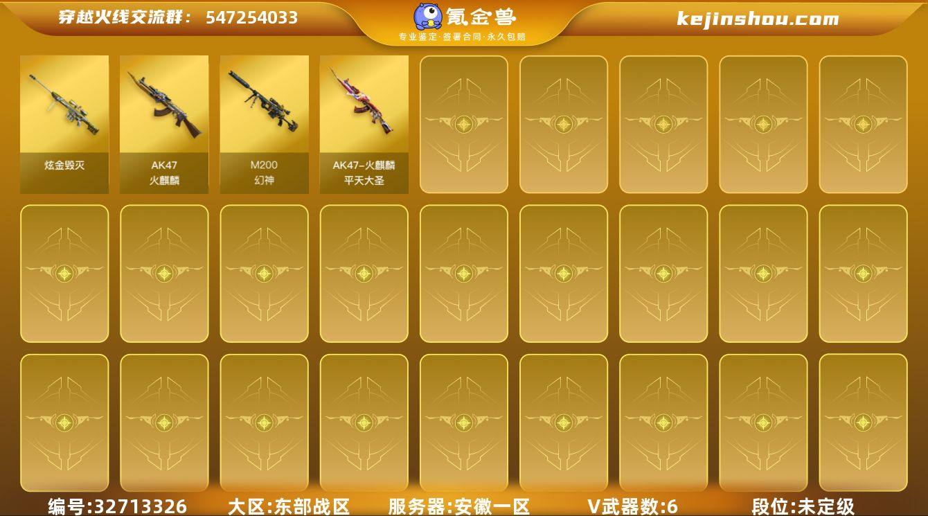 安徽一区-6V-0王者武器数-1炫金武器数 【热门武器】:M200-幻神 【王者炫金武器】:炫金毁灭 【皮肤】:火麒麟-平天大圣 【角色】:北极狐-X,初恋灵狐,风暴女,嘉年华灵狐,兰-新年限定,灵狐者-X,龙儿,麻雀,曼陀罗-X,青霞仙子,斯沃特-X,蜀雪,新娜塔莎,雪莉杨,影武者-X 【人偶武器】:迷你深渊冰龙,迷你牛魔王,迷你波特博士*3,迷你牛牛,深渊终结者手雷*2,迷你艾比 【英雄级武器】:AK47-火麒麟,M200-幻神 【源级武器】:源·雷神,源-金色蔷薇,AWM-裁决-百城联赛天津,魂·裁决-新人王绿豆,御·炼狱-女娲,魂·屠龙-春桃,魂·屠龙-都是Cfer,魂·麒麟刺-神秘黑洞*2 【道具】:战舰背包,白狐背包,背包-洛丽塔,超级背包,妩媚妖姬,变异宝贝,生化弹匣,夺命之镰,防化服,金色流光-枪王排位*2,星辰流光-枪王排位,枪王排位28赛季金色流光,枪王排位29赛季金色流光,防弹头盔*4,防弹衣*4,C4工具钳*4,手雷包*4 【特殊枪械】: