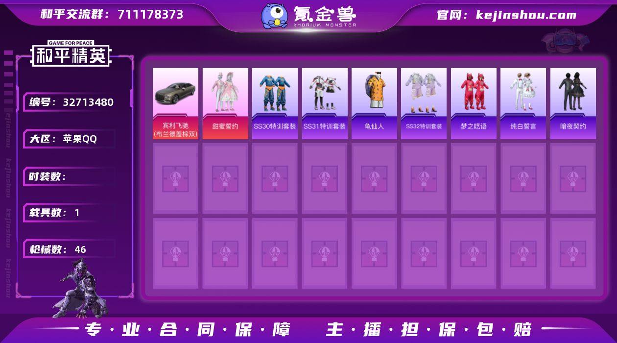 苹果Q 不可二次 1载具1粉装31套装46枪皮 宾利飞驰布罗德盖棕双色 甜蜜誓约 马卡龙背包 龟仙人 暗夜契约 纯白誓言 梦之呓语 和平精英账号