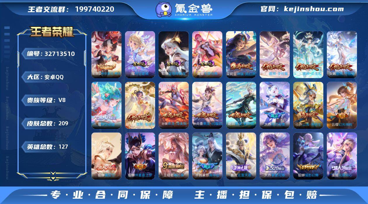 【941570】【精品女号推荐·万战大乔·金标貂蝉·全皮大乔·颠倒童话魔镜·沐霞之诺·紫瑶·时之祈愿·金色貂蝉·神骥鸣幻洲·愿照千秋盛·愿照众生和·愿照福禄聚·貂蝉曦玄引·山海琳琅生·愿照岁时盈·映山客·乘龙问璇玑·炽翼辉光·山海碧波行·乘龙聚宝船·可二次】YXw21580-安卓Q-127英雄-209皮肤-6王者印记-160铭文-贵族积分7w【贵族8】【1典藏·4星传说·24传说·39按键】【因赛季更新游戏段付以上号为准!】 【英雄全皮】:大乔全皮,敖隐全皮 【荣耀典藏】:安琪拉颠倒童话魔镜 【星元皮肤】:大乔沐霞之诺,虞姬无限倾慕,瑶时之愿境,貂蝉金色仲夏夜 【传说皮肤】:朵莉亚神骥鸣幻洲,女娲愿照千秋盛,妲己愿照众生和,蔡文姬愿照福禄聚,虞姬愿照岁时盈,云缨幻光神枪,嬴政玄雷天君,王昭君映山客,庄周牧神诗旅,貂蝉曦玄引,孙尚香乘龙问璇玑,孙策乘龙淬吴钩,赵云乘龙铭钟鼎,大乔时之奇旅,干将莫邪画中仙,花木兰燃星之曲,虞姬无限倾心,伽罗炽翼辉光,小乔山海琳琅生,大乔挚爱花嫁,瑶时之祈愿,虞姬启明星使,貂蝉猫影幻舞,貂蝉仲夏夜之梦 【限定皮肤】:蔡文姬夏日便利店,大乔绒语心约,虞姬夏日便利店,姜子牙天穹之誓,狄仁杰阴阳师,小乔山海琳琅生,赵云皇家上将,庄周...