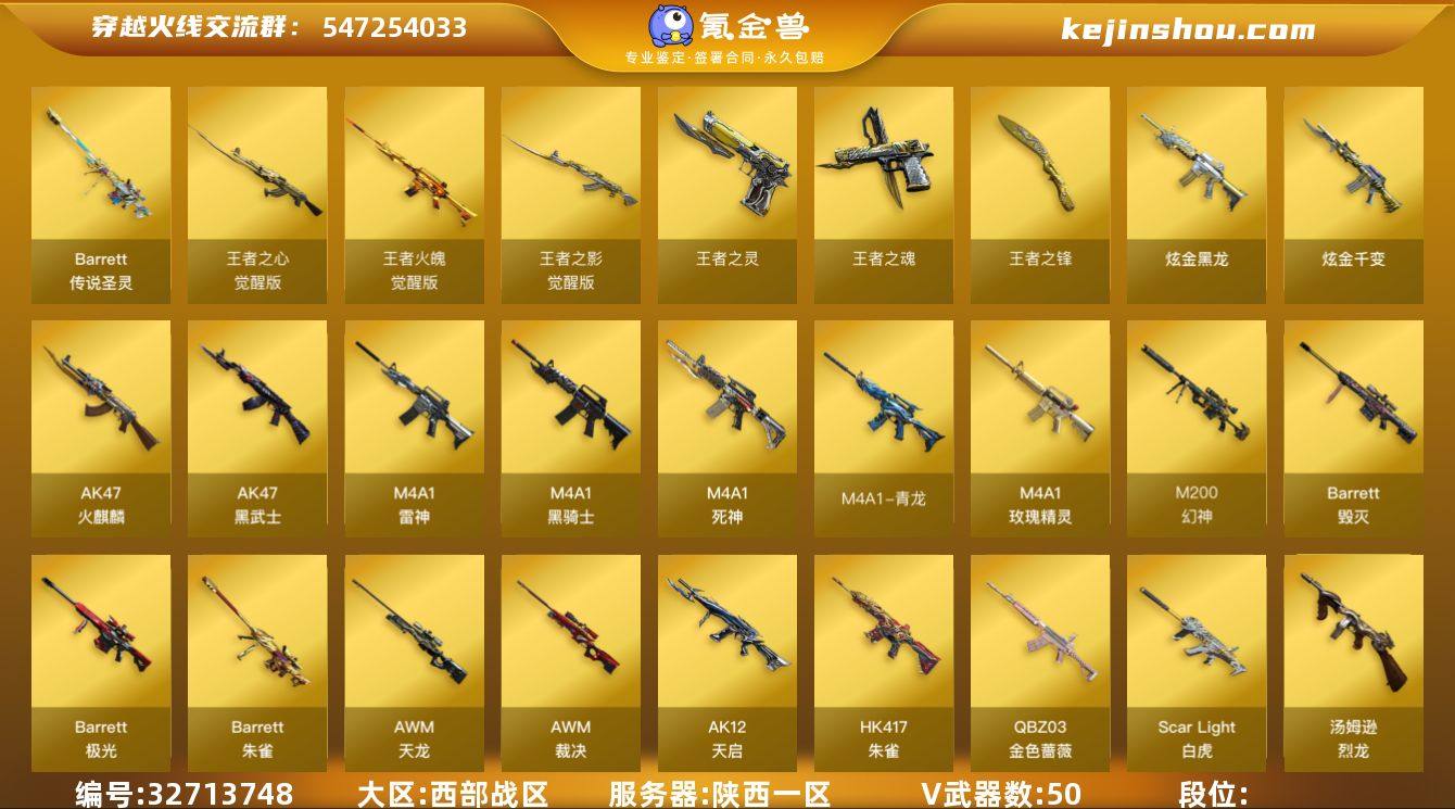 西部战区(陕西一区)ys【精品爆破号】传说【传说圣灵】50v【M200-幻神,M200-竞技荣光,QBZ03-金色蔷薇,ScarLight-白虎,HK417-朱雀,M4A1-青龙,荣耀世冠-雷神,AWM-裁决,柯尔特-冠军之特,Colt1911-小故障】7王者【王者之心,王者之影,王者火魄,王者之魂,王者之灵,王者之锋】2炫金【炫金黑龙,炫金千变】2角色【葵,樱,职业选手】2音效【Barrett-毁灭音效卡,M4A1-黑骑士音效卡】10皮【黑骑士-冠军之势,雷神-冠军之魄,火麒麟-雷神,毁灭-SV-CFPLS16冠军,无影-霓裳】(信用分100)截图展示段位不代表实际段位 如赛季更新等不可抗拒因素发生变化、时限道具不保证所剩时间