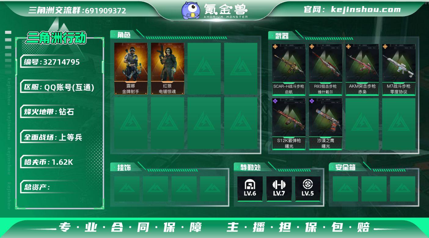 DSJZ1842【资产86.9M 电锯惊魂红狼 金牌射手】三端互通-总价值86.95M-哈夫币1,629.45-烽火地带等级60-烽火地带段位钻石【干员皮肤】红狼-电锯惊魂 露娜-金牌射手【近战武器】黑鹰【枪皮】腾龙突击步枪-古铜 QBZ95-1突击步枪-海岸线 K437突击步枪-巨兽 SG552突击步枪-巨兽 M4A1突击步枪-高雅黑 M4A1突击步枪-海色 M4A1突击步枪-繁盛 AKM突击步枪-肃杀 AKM突击步枪-赤枭 QBZ95-1突击步枪-高雅黑 QBZ95-1突击步枪-海浪 QBZ95-1突击步枪-海色 QBZ95-1突击步枪-2026 AKS-74U突击步枪-磐石 AKS-74U突击步枪-冰天雪地 ASh-12战斗步枪-繁盛 K416突击步枪-几何迷彩 K416突击步枪-高雅黑 K416突击步枪-重击 K416突击步枪-一帆风顺 K416突击步枪-冬日风情 K416突击步枪-缄默情歌 M16A4突击步枪-高雅黑 AUG突击步枪-浅蓝涂装 M7战斗步枪-红色涂装 M7战斗步枪-黑巧甜心 M7战斗步枪-捣蛋鬼 M7战斗步枪-百步穿杨 M7战斗步枪-零度协议 SG552突击步枪-浅蓝涂装 SG552突击步枪-海浪 SG552突击步枪-狂欢 SG552突击步枪-2026 SG552突击步枪-马年新春 SG552突击步枪-贴花艺术 SG552突击步枪-哈夫克警备 SG552突击步枪-运动员 AK-12突击步枪-变色龙 AK-12突击步枪-动力机能 SCAR-H战斗步枪-数码迷彩...