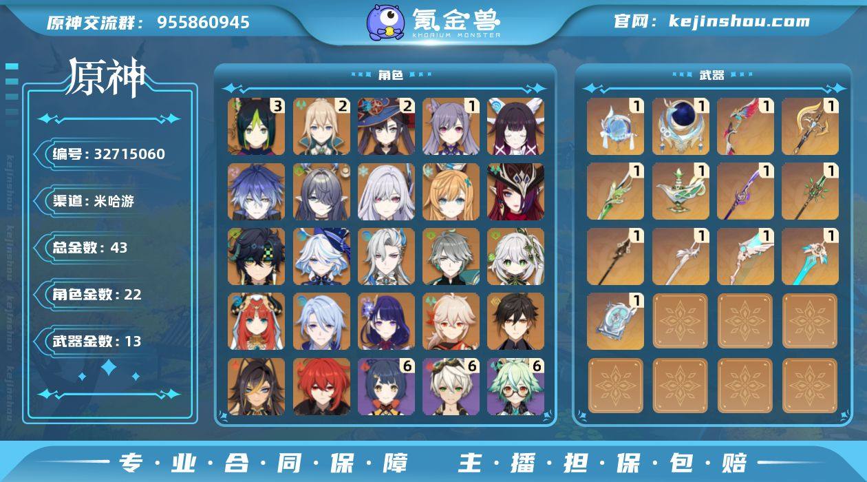 邮箱: 未绑定 总黄数: 43 冒险等级: 59 3命金色角色: 三命提纳里 2命金色角色: 二命莫娜,二命琴 1命金色角色: 一命刻晴 0命金色角色: 迪卢克,枫原万叶,钟离,雷电将军,神里绫人,妮露,纳西妲,艾尔海森,迪希雅,那维莱特,芙宁娜,基尼奇,恰斯卡,爱可菲,丝柯克,菈乌玛,菲林斯,哥伦比娅 拥有武器: 天空之翼,四风原典,和璞鸢,风鹰剑,天空之刃,贯虹之槊,薙草之稻光,千夜浮梦,裁叶萃光,裁断,星鹫赤羽,纺夜天镜,帷间夜曲 1精武器: 天空之翼,四风原典,和璞鸢,风鹰剑,天空之刃,贯虹之槊,薙草之稻光,千夜浮梦,裁叶萃光,裁断,星鹫赤羽,纺夜天镜,帷间夜曲