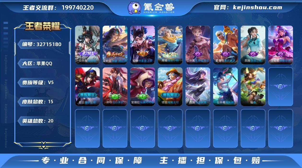 可换绑【精品无双小号·无双公孙离·马限朵莉亚·无二次包人脸】 1按键 没有五级铭文 无二次包过BX5666 苹果Q-V5-15皮肤-1无双-2传说-5史诗 【英雄全皮】:孙权全皮 【无双皮肤】:公孙离离恨烟 【传说皮肤】:朵莉亚神骥鸣幻洲,貂蝉仲夏夜之梦 【限定皮肤】:公孙离离恨烟,赵云皇家上将,项羽海滩派对 【战令限定】:周瑜线条小狗 【史诗皮肤】:周瑜线条小狗,西施诗语江南,公孙离无限星赏官,夏侯惇乘风破浪,王昭君偶像歌手,赵云皇家上将 【其他皮肤】:孙权径山谋武,安琪拉玩偶对对碰,项羽海滩派对,西施归虚梦演,瑶森,公孙离花间舞 【营地ID】:1544816490