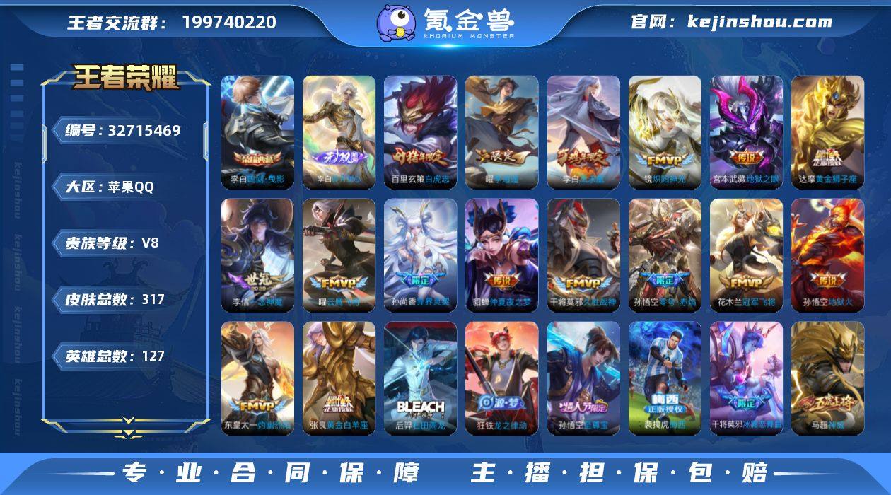 V8 1典藏 1无双 20传说 127英雄 317皮肤 可修改实名 女号 【英雄全皮】李白全皮,孙权全皮,蚩奼全皮,刘邦全皮,大禹全皮 【稀有英雄】大司命,嬴政(始皇帝),韩信(韩跳跳),夏洛特(夏师傅),艾琳,橘右京(橘子),娜可露露(鸟人),不知火舞,赵云,金蝉(唐僧),戈娅 【荣耀水晶】鸣剑·曳影 【无双皮】碎月剑心(李白无双) 【传说皮】神树通天,李逍遥,黄金狮子座,黄金白羊座,零号·赤焰,地狱火,仲夏夜之梦(大飞蛾),地狱之眼,一念神魔,冠军飞将,久胜战神,云鹰飞将(小将军),炽阳神光,灼幽烈阳 【珍宝阁皮】妄想食味,优雅恋人,玩趣恶龙 【赛季/战令皮】噬灭天穹(s37),古海寻踪(s33),擒涛扼浪(s31),探海日志(s32),剑破天穹(s35),天穹祈灯(s34),炼金王(s6),凯尔特女王(s7),狰(s8),饕餮(s9),烛龙(s10),重明(s11),穷奇(s12),御狮(s13),御霄(s14),御旌(s15),御銮(s16),朔风刀(s17),混沌棋(s18),疑决卦(s19),醍醐杖(s20),原初探秘者(s21),万华元夜(s22),演武夺筹(s23),驱傩正仪(s24),猎兽之王,白昼王子,朔望之晖,蓝屏警告,神迹守卫-钟馗,狮舞东方,赤莲之焰,驯魔猎人,星空之诺,银河之约,夺宝奇兵,迷踪丽影,西部大镖客-猪八戒,暗影游猎(游乐娃子),单词大作战,狂想玩偶喵,潮玩骑士王,云间偶戏 【史诗皮】...