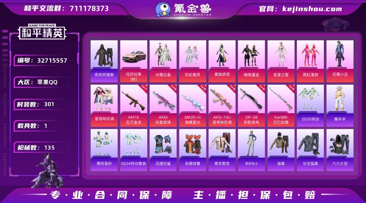 实名: 可修改 时装数: 301 载具数: 1 枪械数: 135 战备数: 1 热门装扮: 奇异狩猎者,呆萌铁蟹,迅捷狂鲨,冰霜白皇,彩虹鹿灵,暗夜鎏金,黄族统领,圣堂之誓,霓虹漫游,星穹咏叹调,狂魇小丑 载具: 玛莎拉蒂Ghibli(粉) 稀有枪皮: AKM炫紫旋律,M416五爪金龙,MK20-H-海螺星光,Kar98K-巳巳如意,AKS-74U-星穹咏叹调,DP-28-豹影疾电 亮点: 【优质装备】:奇异狩猎者,七级M416-五爪金龙