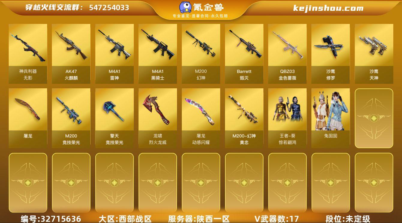 MCF780【陕西一区 17V 王者级3 m200-幻神 m200-竞技荣光 幻神黄忠】【等级】94【区服】陕西一区【英雄角色】0【英雄武器】17【王者级武器】王者之烈-觉醒版 悦蓝-惊涛骇浪-觉醒版【英雄级武器】 龙啸-烈火龙威 无影-神兵利器 AK47-火麒麟 M4A1-黑骑士 M200-幻神 擎天-竞技荣光 M200-竞技荣光 闪光弹-竞技荣光 烟雾弹-竞技荣光 高爆手雷-竞技荣光 擎天-竞技荣光 沙鹰-修罗 沙鹰-天神 QBZ03-金色蔷薇 M4A1-雷神 屠龙 Barrett-毁灭【挑战级武器】乱世-超越1 神圣爆裂者-末日III【通用级角色】猎狐者-11周年 影武者-X 灵狐者-X 潘多拉-X 救世主-X 雪莉杨 北极狐-X 妲己 麻雀 兔囡囡 斯沃特-X 风暴女 木兰 嘉年华灵狐【通用级武器】灵·屠龙-嘉年华【强化级角色】复仇者 堕天使 铁扇公主 修道士 乔伊教练