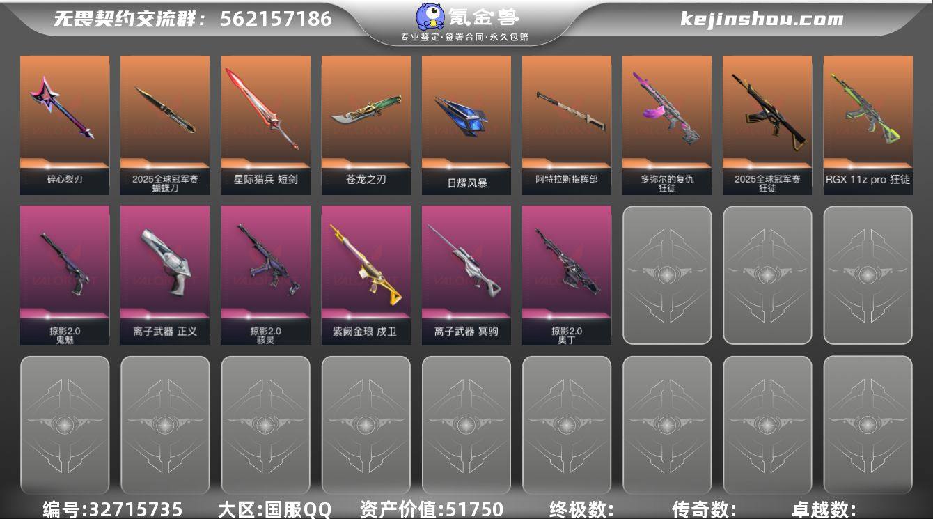 MWW476【51750价值 25冠军套 5周年 21橙 11紫】【游戏等级】Lv185 【段位】 铂金II 【R点】955 【皮肤总价值】51,750 【英雄数量】28 【皮肤数量】91 【挂饰数量】71 【卡面数量】103 【喷漆数量】102 【步枪皮肤】 【狂徒】 狂徒-RGX11zPro 狂徒-幻心猎手 狂徒-多弥尔的复仇 狂徒-2025全球冠军赛 狂徒-瑰梦艺语 狂徒-洪荒怒焰 狂徒-盖亚的复仇 狂徒-阿特拉斯指挥部 狂徒-混沌序曲 狂徒-诡秘蛇影 【近战武器】 近战武器-圣石匕首 近战武器-碎心裂刃 近战武器-2025全球冠军赛蝴蝶刀 近战武器-星际猎兵短剑 近战武器-天御刀 近战武器-嘟昂嘟昂超弹力水球拳套 近战武器-阿特拉斯指挥部甩棍 近战武器-影钩 近战武器-5周年//公测重制版苍龙之刃 近战武器-日耀风暴遗器 近战武器-穿花蝴蝶 近战武器-诡秘蛇影军刀 【鬼魅】 鬼魅-幻心猎手 鬼魅-瑰梦艺语 鬼魅-掠影//2.0 鬼魅-甜蜜战术 鬼魅-诡秘蛇影 【幻影】 幻影-甜心猎手 幻影-星际猎兵 幻影-洪荒怒焰 幻影-悠闲猫生 幻影-掠影//2.0 幻影-神中神罚 幻影-侦察力量 幻影-日耀风暴 幻影-末日之翼 【冥驹】 冥驹-诛心猎手 冥驹-光环序列 冥驹-离子武器 冥驹-甜蜜战术 【戍卫】 戍卫-甜心猎手 戍卫-光环序列 戍卫-紫阙金琅 戍卫-太空...
