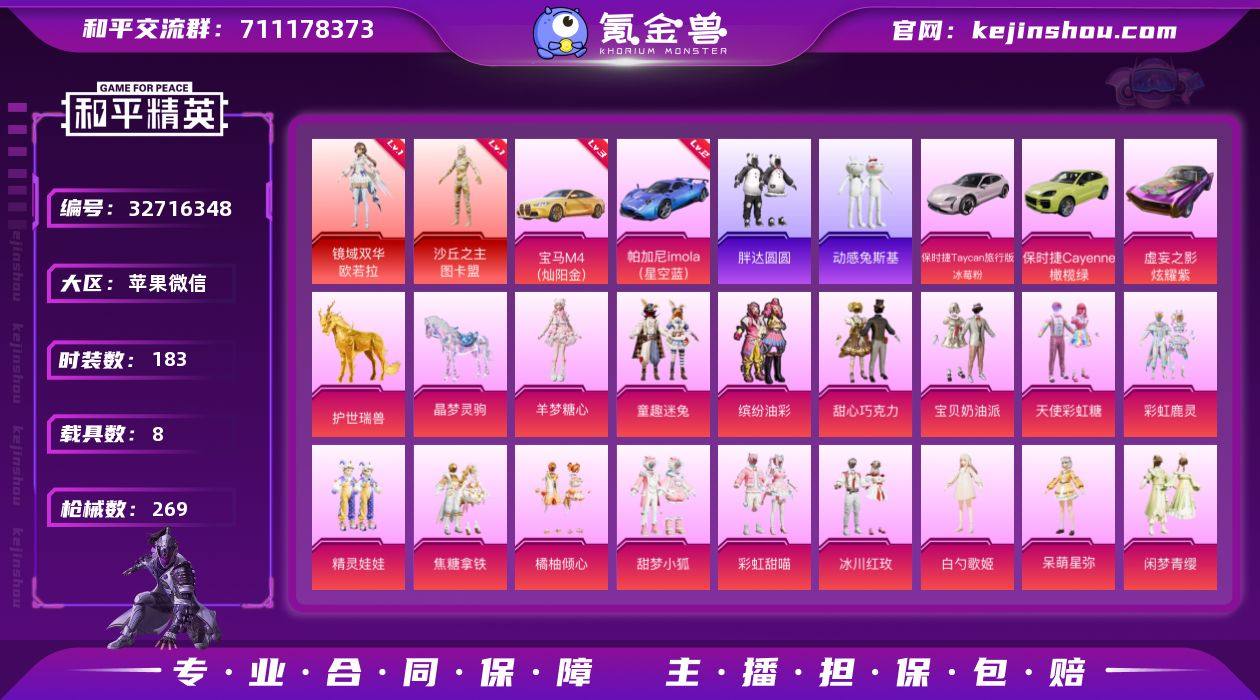 【包人脸】【特价售出】 苹果 微信-3神装-29粉装-25特效枪-8载具-20粉色飞行器-120212热力值-6王牌印记-183套装-269枪皮 【红色载具】:帕加尼imola(星空蓝)(二级),宝马M4(灿阳金)(三级) 【红色神装等级】:暮色玫影-艾丽娅(五级),镜域双华-欧若拉(一级),沙丘之主-图卡盟(一级) 【红色角色神装】:暮色玫影-艾丽娅,镜域双华-欧若拉,沙丘之主-图卡盟 【热门品类】:粉装-童趣迷兔,粉装-缤纷油彩,套装-胖达圆圆,套装-动感兔斯基人偶服,角色-2B战斗服款,套装-龟仙人,角色-Mark.06,套装-红熊茄茄 【粉色套装】:粉装-甜心巧克力,粉装-宝贝奶油派,粉装-天使彩虹糖,粉装-缤纷油彩,粉装-童趣迷兔,粉装-彩虹鹿灵,粉装-精灵娃娃,粉装-焦糖拿铁,粉装-橘柚倾心,粉装-甜梦小狐,粉装-彩虹甜喵,粉装-冰川红玫,角色-白勺歌姬,角色-呆萌星弥,粉装-闲梦青缨,粉装-憨憨奶龙,角色-小叽联名款,粉装-蜜语绒猫,角色-美琪,角色-鸢尾晶梦,角色-守护天翼,角色-千金淑猫,角色-樱桃泡泡,粉装-星穹咏叹调,角色-狂魅哈莉,角色-绯月迷踪,角色-羊梦糖心,角色-回旋牧梦使,人物-小舞·恋语 【粉色枪皮等级】:AKM-暮色玫影(一级),M16A4-晶梦幻蝶(四级),SCAR-L-灵...
