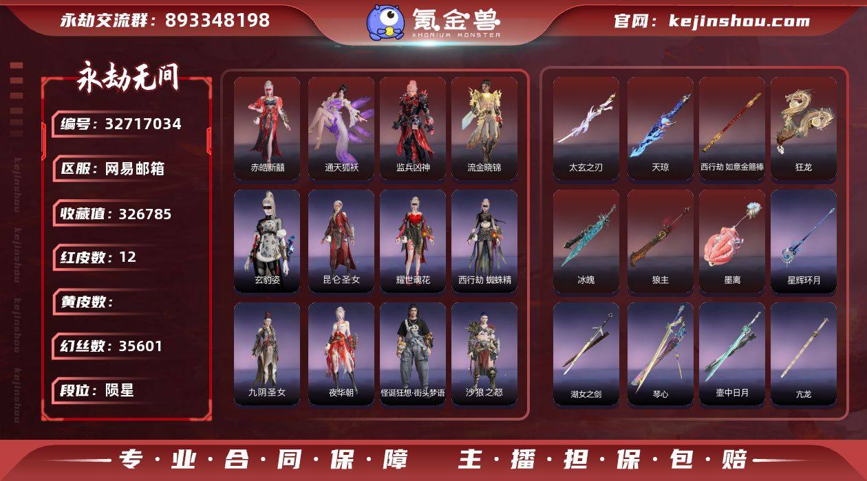 【红皮】:墨离(飞索皮肤),冰魄(长剑皮肤),狼主(阔刀皮肤),狂龙(双节棍皮肤),西行劫·如意金箍棒(棍皮肤),通天狐袄(玉玲珑皮肤),天琼(匕首皮肤),赤皓新囍(宁红夜皮肤),监兵凶神(胡为皮肤),流金晓锦(刘炼皮肤),太玄之刃(太刀) 【外观总数】12红 583 金 幻丝:35601金砖: 收藏值:32W 【换绑】:4.25可换绑,期间登录网易大神不影响正常游戏,其他皮肤可参考以下截图,道具、段位以实际验号为准,段位因赛季原因发生变化,以上号为准"