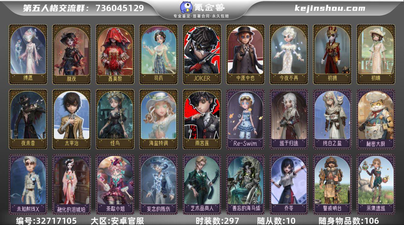 账号类型: 手机账号 时装数: 297 时装: 26号守卫-西部大亨,红蝶-紫孔雀,画家-江户川乱步,“杰克”-白纹大触,“杰克”-夜来香,机械师-佐仓双叶,机械师-Re-Swim,祭司-神圣之辉,击球手-迫降专家,空军-“苏珊娜”,勘探员-中原中也,鹿头-林间狩者,魔术师-广津柳浪,冒险家-爱丽丝,盲女-甜心蛋糕,盲女-吉尔达,“囚徒”-太宰治,入殓师-诺曼,宿伞之魂-安魂曲,宿伞之魂-残花泪,宿伞之魂-箭竹,摄影师-暮剑,调香师-致命温柔,调香师-今夜不再,调香师-冰上舞蹈,调酒师-海盐特调,舞女-高卷杏,幸运儿-苗木诚,先知-观测者,医生-往昔,园丁-罗刹绯春,园丁-奥村春,园丁-怪鸟,佣兵-弹簧手,佣兵-达克斯上校,邮差-初拥,蜘蛛-长腿小姐,咒术师-缄默者,杂技演员-雨宫莲,杂技演员-JOKER,杂技演员-梶井基次郎,前锋-阿瓦尔的战车,调香师-提炼师,咒术师-灰烬狂想,园丁- 初晴,医生-永生花,渔女-百万人鱼,入殓师-记忆之骑,先知-纯白之盐,幸运儿-蛋小黄的好朋友,时空之影-“有机磷”,宿伞之魂-桃面书生,“法罗女士”-芳泽霞,舞女-流离的月光,古董商-OPH.QI,画家-多色印刷,“博士”-“裁纸机”,机械师-“锁芯”,拉拉队员-采集速巡,飞行家-警戒哨台,医生-司药,古董商-乔苓,雕刻家-善忘的海马体,骑士-艺术品商人,气象学家-茶歇小姐,红...