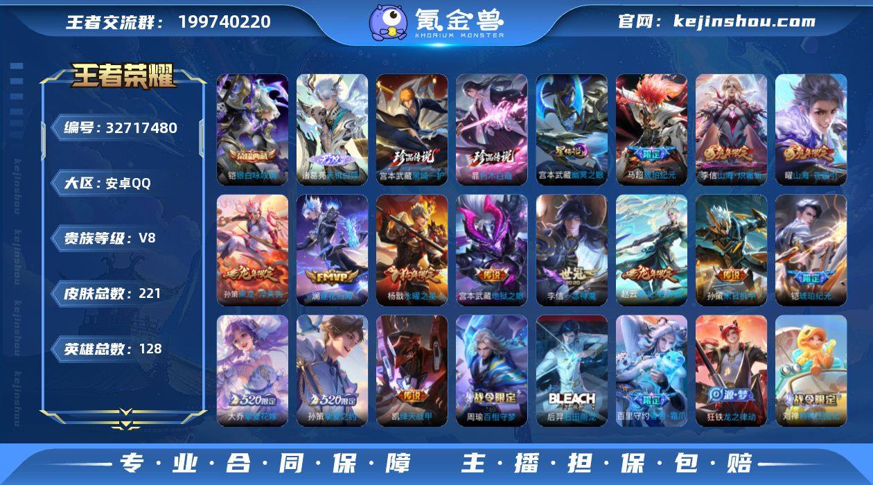 泽·银白咏叹调·黑崎一护·朽木白哉·天机无算天幕·黑崎一护天幕·挚爱童话天幕·神骥镇沧海·神骥逐星野·花木兰异界灵契·诡秘之主·愿照山河定·乘龙淬吴钩·乘龙铭钟鼎·马超琥珀纪元·铠琥珀纪元·山海炽霜斩·山海苍雷引·挚爱花嫁·挚爱之约·永曜之星·无二次包过】w21579-安卓Q-128英雄-221皮肤-3王者印记-175铭文-贵族积分6w【贵族8】【1典藏·1无双·2珍品·1星传说·23传说·3天幕·19按键】【因赛季更新游戏段付以上号为准!】 【英雄全皮】:敖隐全皮 【荣耀典藏】:铠银白咏叹调 【无双皮肤】:诸葛亮天机白泽 【珍品传说】:宫本武藏黑崎一护,暃朽木白哉 【星元皮肤】:宫本武藏幽冥之眼 【天幕】:天机无算天幕,黑崎一护天幕,挚爱童话天幕 【传说皮肤】:关羽神骥镇沧海,马超神骥逐星野,花木兰异界灵契,后羿神树通天,干将莫邪千山共赴,元歌诡秘之主,司空震愿照山河定,桑启鸣野蒿,孙策乘龙淬吴钩,赵云乘龙铭钟鼎,马超琥珀纪元,铠琥珀纪元,澜逐花归海,曜山海苍雷引,李信山海炽霜斩,大乔挚爱花嫁,孙策挚爱之约,孙策末日机甲,铠绛天战甲,虞姬启明星使,李信一念神魔,杨戬永曜之星,宫本武藏地狱之眼 【限定皮肤】:蔡文姬夏日便利店,虞姬夏日便利店,姜子牙天穹之...