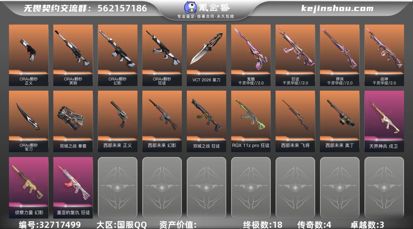 【941715】可二次 卖号能回血 5w库存 颗秒套装+千灵套装+西部套装 精品账号 qyz9700 【近战武器】:近战武器-碎心裂刃,近战武器-VCT 2026 篆刀,近战武器-流风回雪,近战武器-ORA x 颗秒 军刀,近战武器-剥皮小刀,近战武器-双城之战 拳套,近战武器-未来开拓者,近战武器-夜刃诡镰 【狂徒】:狂徒-双城之战,狂徒-RGX 11z Pro,狂徒-ORA x 颗秒,狂徒-千灵华绽//2.0,狂徒-盖亚的复仇,狂徒-诡秘蛇影 【幻影】:幻影-西部未来,幻影-ORA x 颗秒,幻影-侦察力量,幻影-神圣领域,幻影-末日之翼,幻影-西部未来 【戍卫】:戍卫-天界神兵,戍卫-折光棱晶 【獠犬】:獠犬-神圣领域 【冥驹】:冥驹-ORA x 颗秒 【飞将】:飞将-西部未来,飞将-末日之翼 【莽侠】:莽侠-千灵华绽//2.0,莽侠-诡秘蛇影,莽侠-月球哨兵 【战神】:战神-千灵华绽//2.0,战神-神圣领域 【奥丁】:奥丁-西部未来,奥丁-末日之翼 【判官】:判官-诡秘蛇影 【雄鹿】:雄鹿-月球哨兵 【骇灵】:骇灵-星云暗涌 【蜂刺】:蜂刺-星云暗涌,蜂刺-折光棱晶 【标配】:标配-折光棱晶 【正义】:正义-西部未来,正义-ORA x 颗秒,正义-纳米打击,正义-月球哨兵 【鬼魅】:鬼魅-千灵华绽//2.0 【狂怒】:狂怒-神...