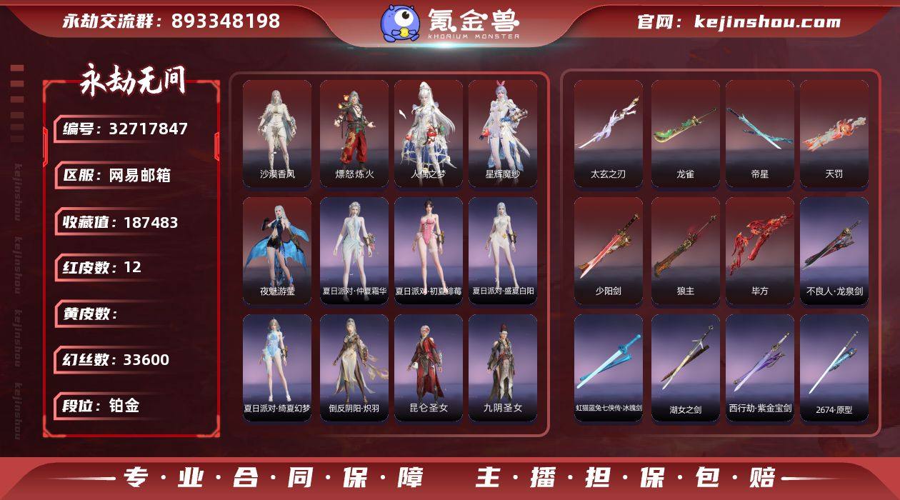 【红皮】:沙漠香风(迦南皮肤),熛怒炼火(季沧海皮肤),狼主(阔刀皮肤),毕方(弓箭皮肤),少阳剑(长剑皮肤),夜魅游莹(季莹莹皮肤),天罚(火炮皮肤),星辉魔纱(沈妙皮肤),帝星(横刀皮肤),龙雀(阔刀皮肤),人偶之梦(妖刀姬),太玄之刃(太刀) 【外观总数】12红 250 金 幻丝:金砖: 收藏值:18w 【换绑】:4.25可换绑,期间登录网易大神不影响正常游戏,其他皮肤可参考以下截图,道具、段位以实际验号为准,段位因赛季原因发生变化,以上号为准"