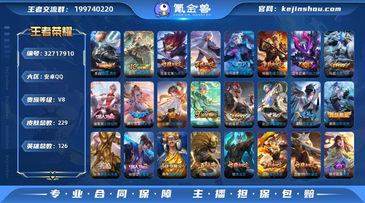 【王者荣耀】珍品无双0 典藏1 无双0 珍品传说0 传说19 史诗52 英雄126 皮肤229 贵族8级 荣耀典藏:鸣剑·曳影__传说皮肤:鸣野蒿|前尘镜|深海之息|无双飞将|启明星使|地狱之眼|云霓雀翎|久胜战神|狄仁杰-超时空战士|黄金白羊座|刘备-时之恋人|淬星耀世|孙尚香-末日机甲|白虎志|凤求凰|武陵仙君|永曜之星|幻光神枪|神树通天__稀有限定:至尊宝|青龙志|朱雀志|神威|李小龙|梁祝|狮舞东方|拒霜思|白昼王子|大漠名商|繁星吟游|高山流水|古海寻踪|海滩派对|海盐诗旅|皇家上将|辉光之辰|混沌棋|剑破天穹|金庭之子|凯尔特女王|狂想玩偶喵|蓝屏警告|黎明之约|炼金王|迷踪丽影|魔术师|千军破阵|擒涛扼浪|穷奇|驱傩正仪|沙漠行僧|蜃楼王|朔风刀|死亡摇滚|探海日志|饕餮|醍醐杖|天穹祈灯|万华元夜|纤云弄巧|项羽-霸王别姬|星空之诺|驯魔猎人|演武夺筹|妖精王|疑决卦|阴阳师|银河之约|御旌|御銮|御狮|原初追逐者|逐梦之星|暗隐猎兽者|白龙吟|缤纷独角兽|冰冠公主|乘风破浪|德古拉伯爵|地狱岩魂|黄金分割率|节奏热浪|金属风暴|魅力维加斯|梦奇-顽趣|偶像歌手|奇遇舞章|赏金猎手|圣诞恋歌|水果甜心|孙策-猫狗日记|晚萤|星夜王子|鹰眼统帅|永昼|噬灭天穹|修罗|千年之狐|无限星赏官|舞动绿茵|特工...