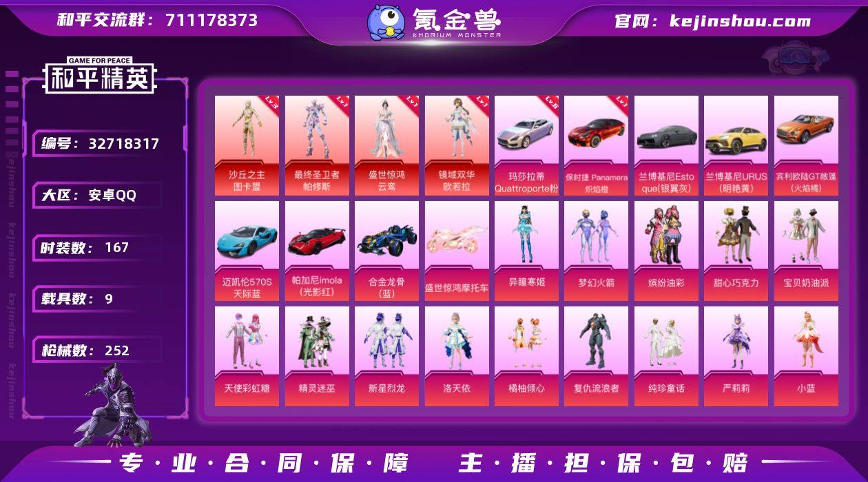 玛莎拉蒂Quattroporte(幻星粉)(六级) 可二次【特价出售/店主推荐】安卓 手Q-4神装-20粉装-13特效枪-9载具-11粉色飞行器-109291热力值-5王牌印记-167套装-252枪皮【红色载具】:玛莎拉蒂Quattroporte(幻星粉)(六级),保时捷Panamera(炽焰橙)(一级)【红色神装等级】:最终圣卫者-帕修斯(一级),盛世惊鸿-云鸾(一级),镜域双华-欧若拉(一级),沙丘之主-图卡盟(三级)【红色角色神装】:最终圣卫者-帕修斯,盛世惊鸿-云鸾,镜域双华-欧若拉,沙丘之主-图卡盟【热门品类】:粉装-梦幻火箭,粉装-缤纷油彩,套装-浪漫天命,角色-军刀雅典娜,套装-暗夜行者,套装-龟仙人,角色-8号机,角色-Mark.06【粉色套装】:粉装-甜心巧克力,粉装-宝贝奶油派,粉装-天使彩虹糖,粉装-精灵迷巫,粉装-梦幻火箭,粉装-缤纷油彩,粉装-新星烈龙,角色-洛天依,粉装-橘柚倾心,角色-复仇流浪者,粉装-纯珍童话,角色-严莉莉,角色-小蓝,角色-美琪,角色-脉冲星,角色-初号机 觉醒Ver.,角色-狂花道·不知火舞,角色-月影灵韵,角色-凤凰座 一辉,角色-异瞳寒姬【粉色枪皮等级】:AKM-梦之光华(七级),SCAR-L-梦幻火箭(四级),M416-墨龙九天(六级),UMP45-萌骑冒险(二级),Vector-环太平洋(五...