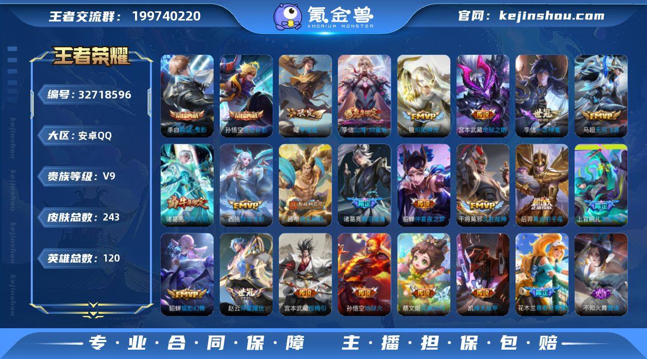 V9 2典藏 28传说 120英雄 242皮肤 可修改实名 男号 【稀有英雄】嬴政(始皇帝),韩信(韩跳跳),夏洛特(夏师傅),艾琳,橘右京(橘子),娜可露露(鸟人),不知火舞,赵云,金蝉(唐僧),戈娅 【荣耀水晶】鸣剑·曳影,全息碎影(猴子典藏) 【传说皮】李逍遥,游龙清影(小青龙),山海·炽霜斩(李信年限),大乔-时之奇旅,黄金射手座,地狱火,仲夏夜之梦(大飞蛾),地狱之眼,一念神魔,淬星耀世,久胜战神,猫影幻舞,炽阳神光,无双飞将,音你心动-小乔,绛天战甲(鸡嘴战神),花朝如约(花篮子),鹤羽星尊,妄想奇谈,惊梅引,遇见神鼓,鲁班七号-时之奇旅 【珍宝阁皮】女武神 【赛季/战令皮】古海寻踪(s33),星界游侠,海盐诗旅(s30),擒涛扼浪(s31),探海日志(s32),流音漫舞,地狱燃心,天穹祈灯(s34),暖冬·兔眠,演武夺筹(s23),驱傩正仪(s24),千军破阵(s25),星际陆战队-达摩,胡桃异想国,神迹守卫-墨子,航海奇遇记,圣弓游侠,真爱魔法,沙漠行僧(s26),金庭之子(s27),午后时光,大漠名商(s28),云中旅人(s29) 【史诗皮】线条小狗-周瑜,紫霞仙子,白龙吟,黄金分割率,鹤归松栖(赵怀真),浮梦罗烟,无限星赏官,冰冠公主,偶像歌手,魅语,百相守梦(关羽),末日机甲-吕布,猫狗日记-孙策,时之恋人-孙尚香,乱世虎臣,节奏热浪,修罗,女仆咖啡,水...