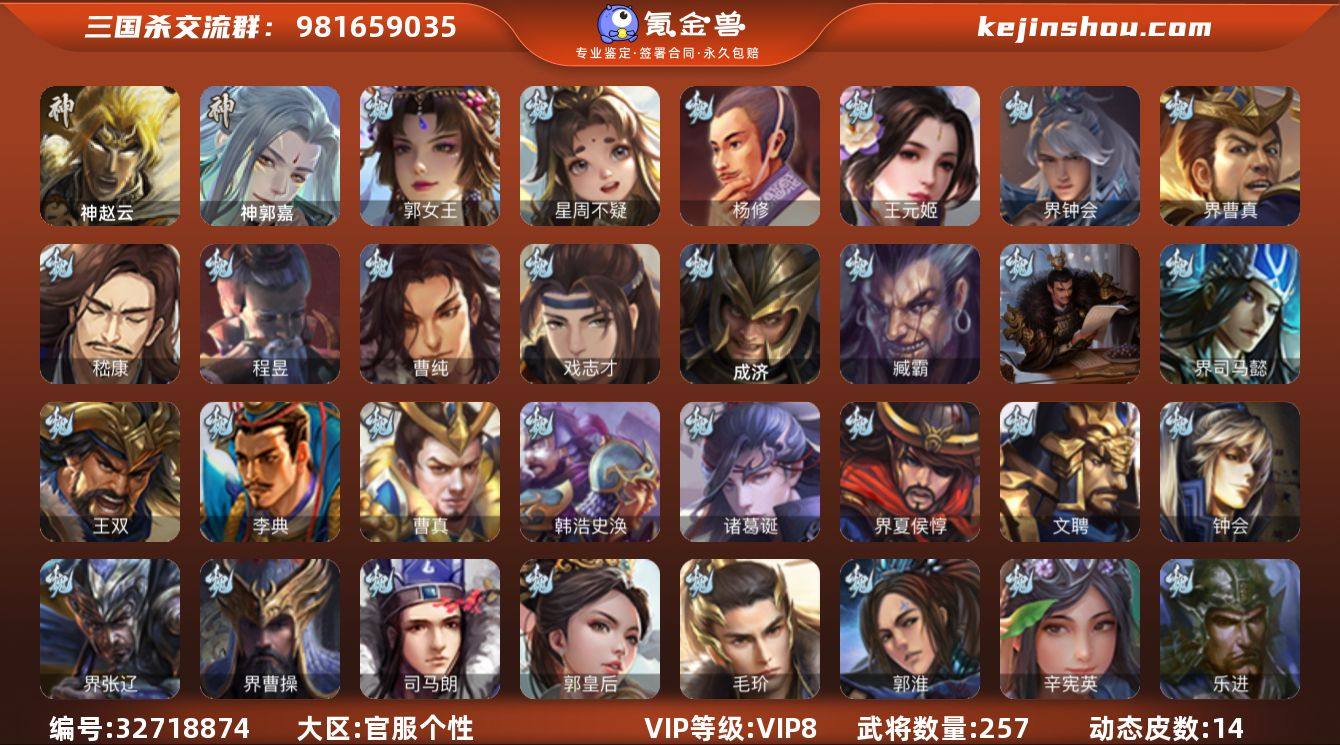 【4047】官阶:骠骑将军;VIP等级:VIP8;史诗武将数量:30;动态皮肤数量:14;武将总数:257;史诗宝珠数量:0;将魂数量:108;神将:2;魏国史诗武将:8;蜀国史诗武将:6;吴国史诗武将:4;群史诗武将:8