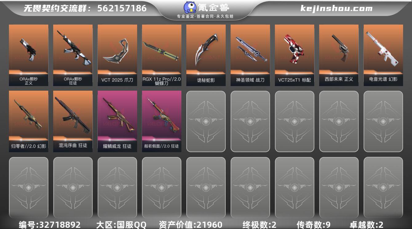 段位: 黑铁 套装: VCTCN2025套装,VCT 2025赛季礼包 近战武器皮肤: 神圣领域 战刀,RGX 11z Pro//2.0 蝴蝶刀,VCT 2025 爪刀,诡秘蛇影 步枪皮肤: 狂徒-耀鳞威龙,狂徒-混沌序曲,狂徒-般若假面//2.0,幻影-归零者//2.0,幻影-电音光谱,狂徒-ORAx颗秒 佩枪皮肤: 标配-VCT25xT1,正义-西部未来,正义-ORAx颗秒 亮点: 【优质装备】:狂徒-混沌序曲,狂徒-耀鳞威龙,神圣领域 战刀,RGX 11z Pro//2.0 蝴蝶刀,VCT 2025 爪刀,诡秘蛇影