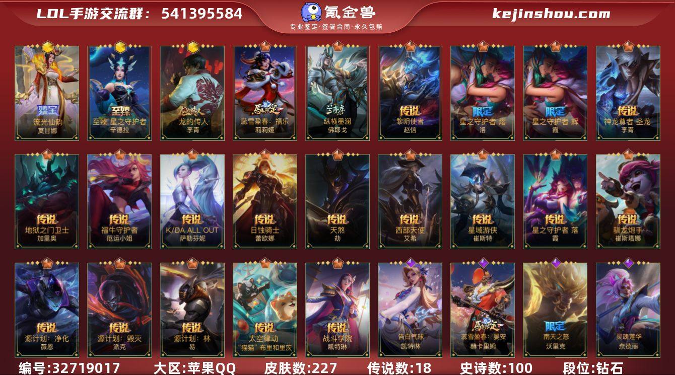实名: 可修改 段位: 钻石 皮肤数: 227 神话皮: 龙的传人,至臻 星之守护者 辛德拉,流光仙韵 莫甘娜 限定皮肤: 龙的传人,星之守护者霞,星之守护者洛 传说皮: 地狱之门卫士,福牛守护者女枪,K/DA ALLOUT萨勒芬妮,日蚀骑士蕾欧娜,天煞劫,西部天使寒冰,星域游侠卡牌,星之守护者 落,驯龙炮手,源计划:净化,源计划:林,太空律动机器人,源计划:毁灭,战斗学院女警,神龙尊者 圣龙 李青,黎明使者 赵信,纵横墨澜 佛耶戈,蕊雪盈春:福乐 莉莉娅 亮点: 【优质装备】:福牛守护者女枪,K/DA ALLOUT萨勒芬妮,日蚀骑士蕾欧娜,天煞劫,西部天使寒冰,星域游侠卡牌,星之守护者 落,驯龙炮手,源计划:净化,源计划:林,龙的传人,龙的传人