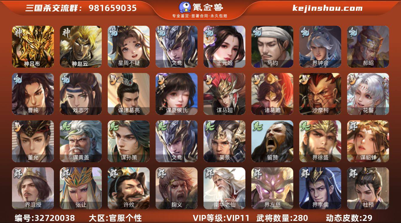 【231】官阶:骠骑将军;VIP等级:VIP11;史诗武将数量:33;动态皮肤数量:29;武将总数:280;史诗宝珠数量:1;将魂数量:7100;神将:3;魏国史诗武将:6;蜀国史诗武将:7;吴国史诗武将:5;群史诗武将:10 神吕布,神赵云,神周瑜,星周不疑,文鸯,王元姬,马钧,界钟会,郝昭,曹纯,戏志才,谋诸葛亮,谋夏侯氏,谋马超,诸葛瞻,沙摩柯,花鬘,董允,谋黄盖,谋孙策,吴景,留赞,界徐盛,谋貂蝉,界沮授,张让,麹义,南华老仙,界左慈,界李儒,杜预,张绣,许攸,神郭嘉-倚星折月(动态),神吕布-冠绝天下(动态),神赵云-战龙在野(动态),神赵云-神龙天降,钟会-潜蛟觊天(动态),程昱-泰山捧日(动态),戏志才-举棋若定(动态),刘备-龙御天下(动态),诸葛亮-龙年限定(动态),卧龙诸葛-龙跃凤鸣(动态),诸葛瞻-绵竹之殇(动态),关索-虎年七夕(动态),孙策-兔年中秋(动态),周处-义除三害(动态),徐盛-破军杀将(动态),文鸯-势若万钧(动态),貂蝉-舞惑群心(动态),麹义-扬刀立威(动态),杜预-龙吟破竹(动态),吕布-虓虎之勇(动态),左慈-役使鬼神(动态),许攸-盛气凌人(动态),界吕布-虓虎之勇(动态),李儒-鸠杀少帝(动态),界李儒-鸠杀少帝(动态)