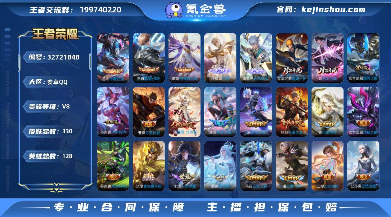 安卓Q-V8-最强王者段位-128英雄-330皮肤-3典藏皮肤-2无双-3珍品传说-27传说-90史诗【英雄全皮】:孙权全皮,暃全皮【荣耀典藏】:李白鸣剑曳影,虞姬神鉴启示录,吕布千魇归渊【无双皮肤】:孙悟空无相,诸葛亮天机白泽【珍品传说】:伽罗沧流箭,宫本武藏黑崎一护,暃朽木白哉【传说皮肤】:云缨神骥越千峰,狄仁杰神骥赴朔漠,马超神骥逐星野,曹操万灵伏威,澜愿照九州拓,云缨幻光神枪,桑启鸣野蒿,亚连落雪白狼,澜逐花归海,露娜霜月吟,公孙离记忆之芯,吕布怒海麟威,马超无双飞将,李元芳飞鸢探春,铠绛天战甲,镜炽阳神光,虞姬启明星使,曜云鹰飞将,李信一念神魔,张良黄金白羊座,干将莫邪久胜战神,达摩黄金狮子座,梦奇胖达荣荣,后羿黄金射手座,杨戬永曜之星,孙尚香末日机甲,宫本武藏地狱之眼【限定皮肤】:暃埋骨钱,虞姬夏日便利店,姜子牙天穹之誓,杨戬破阵退雄兵,狄仁杰阴阳师,赵云皇家上将,墨子神迹守卫,孙尚香蔷薇恋人,庄周高山流水,钟无艳超时空战士,扁鹊奇幻香踪,芈月幻夜卜梦,元歌云间偶戏,元歌无心,甄姬游园惊梦,甄姬落雪兰心,狄仁杰魔术师,狄仁杰万华元夜,达摩沙漠行僧,项羽海滩派对,老夫子航海奇遇记,程咬金演武夺筹,兰...