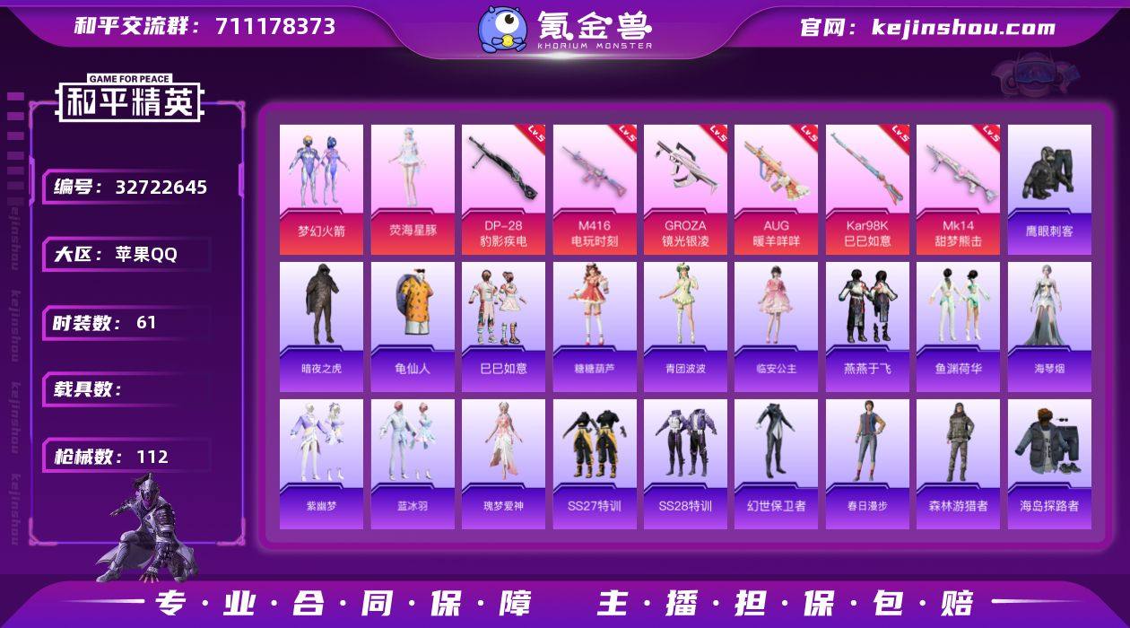 【身法素材号·2粉装6特效·暗夜之虎·梦幻火箭】苹果 手Q-2粉装-6特效枪-0载具-1粉色飞行器-27553热力值-1王牌印记-61套装-112枪皮 【热门品类】:粉装-梦幻火箭,套装-暗夜之虎,套装-龟仙人 【粉色套装】:粉装-梦幻火箭,角色-荧海星豚 【粉色枪皮等级】:M416-电玩时刻(五级),GROZA-镜光银凌(五级),AUG-暖羊咩咩(五级),Kar98K-巳巳如意(五级),Mk14-甜梦熊击(五级),DP-28-豹影疾电(五级) 【粉色枪皮】:M416-电玩时刻,GROZA-镜光银凌,AUG-暖羊咩咩,Kar98K-巳巳如意,Mk14-甜梦熊击,DP-28-豹影疾电 【粉色飞行器】:炫彩糖果飞行器 【粉色降落伞】:梦幻火箭降落伞,江南烟雨降落伞,樱桃泡泡降落伞,炫彩糖果降落伞 【稀有套装】:套装-龟仙人,套装-巳巳如意,套装-炫彩糖果,套装-糖糖葫芦,套装-青团波波,角色-临安公主,套装-燕燕于飞,套装-鱼渊荷华,角色-海琴烟,套装-紫幽梦,套装-蓝冰羽,角色-瑰梦爱神 【稀有枪皮】:AKM-破晓战魂,SCAR-L-夜灯,SCAR-L-玉兔迎春,M416-红色方程式,AUG-耀粉歌者,QBZ-彩虹符号,M762-天降萌叽,AC-VAL-天降萌叽,蜜獾-天降萌叽,ACE32-蓝晶绮麟,UZI-啾咪啾咪,UZI-天降萌叽,UMP45-夜灯,UMP45-绒宝小鹅,Vector-焰鹰...