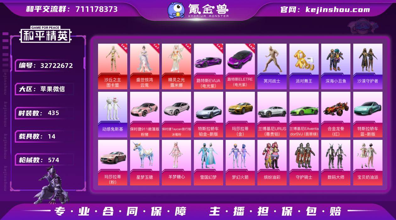 苹果 微信-无敌战神框-4神装-47粉装-40特效枪-14载具-20粉色飞行器-261133热力值-40王牌印记-435套装-574枪皮 【红色载具】:路特斯ELETRE(电光紫)(二级),路特斯EVIJA(电光紫)(三级) 【红色神装等级】:天马神君-驭风(一级),盛世惊鸿-云鸾(一级),精灵之光-露米娜(一级),沙丘之主-图卡盟(六级) 【红色角色神装】:天马神君-驭风,盛世惊鸿-云鸾,精灵之光-露米娜,沙丘之主-图卡盟 【热门品类】:粉装-雪国幻梦,粉装-梦幻火箭,粉装-缤纷油彩,套装-冥河战士,套装-派对舞王,套装-深海小丑鱼,套装-小丑鱼,角色-军刀雅典娜,套装-沙漠守护者,套装-暗夜行者,套装-动感兔斯基人偶服,角色-2B战斗服款,角色-2P战斗服款,套装-SS1特训,套装-暗夜之虎,套装-龟仙人,套装-潮萌小黄鸭,套装-暗影哥特,套装-浪漫波比,套装-萌熊伴侣,熔岩游骑兵连帽夹克,套装-红熊茄茄 【粉色套装】:粉装-守护骑士,粉装-数码大师,粉装-宝贝奶油派,粉装-天使彩虹糖,粉装-火曜朱雀,粉装-金曜白虎,粉装-雪国幻梦,粉装-蝶舞迷情,粉装-精灵迷巫,粉装-梦幻火箭,粉装-星之信仰,粉装-金风玉露,粉装-麻辣鲜香锅,粉装-金属狂野,粉装-缤纷油彩,粉装-古堡领主,粉装-天禅智恒,...