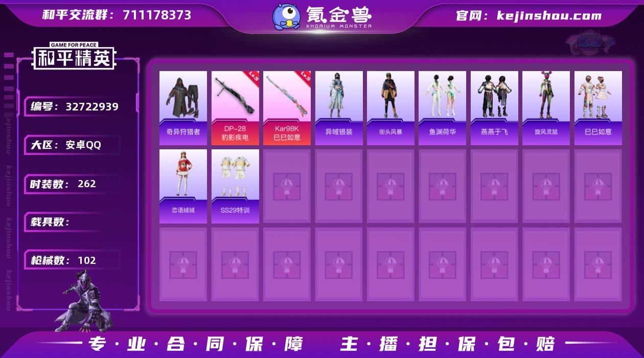 【特价出售】钱包不能注销安卓Q-1稀有5特效枪2热门62套装102枪皮 24422热力值 1印记 历史超级王牌 【1稀有】 奇异狩猎者 【5特效枪】 Kar98K-巳巳如意 (5级) DP-28-豹影疾电 (5级) Mk14-福马献瑞 (5级) AA12-G-萌骑幻想 (3级) ACE32-萌骑漫游 (2级) 【2热门】 破蛋小黄鸡 S686-奇异狩猎者