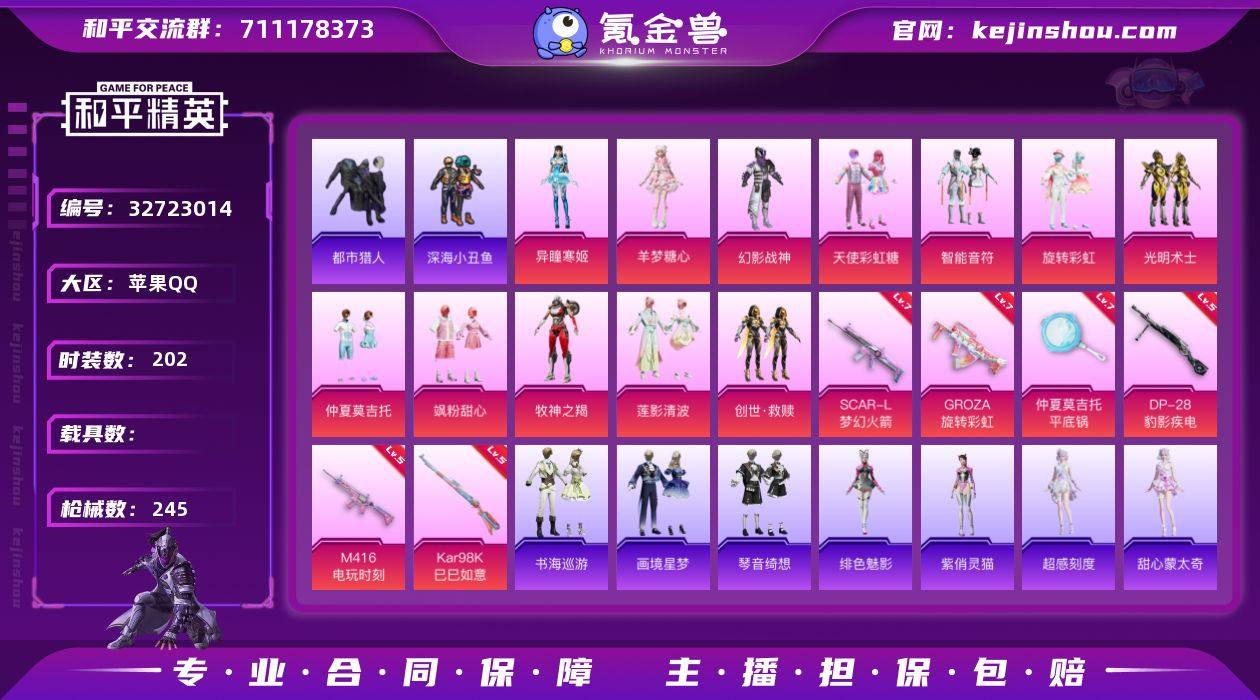 【kyhp775】苹果 手Q-12粉装-9特效枪-0载具-1粉色飞行器-77386热力值-16王牌印记-202套装-245枪皮 【热门品类】:套装-浪漫天命,套装-都市猎人,套装-深海小丑鱼,套装-忍者信条,套装-龟仙人,套装-暗影哥特 【粉色套装】:粉装-幻影战神,粉装-天使彩虹糖,粉装-智能音符,粉装-旋转彩虹,粉装-光明术士,粉装-仲夏莫吉托,粉装-飒粉甜心,粉装-牧神之羯,粉装-莲影清波,套装-创世·救赎,角色-羊梦糖心,角色-异瞳寒姬 【粉色枪皮等级】:SCAR-L-梦幻火箭(七级),M416-电玩时刻(五级),GROZA-旋转彩虹(七级),AKS-74U-森灵之息(五级),Kar98K-巳巳如意(五级),Mk14-福马献瑞(五级),AA12-G-萌骑幻想(四级),DP-28-豹影疾电(五级),平底锅-仲夏莫吉托(七级) 【粉色枪皮】:SCAR-L-梦幻火箭,M416-电玩时刻,GROZA-旋转彩虹,AKS-74U-森灵之息,Kar98K-巳巳如意,Mk14-福马献瑞,AA12-G-萌骑幻想,DP-28-豹影疾电,平底锅-仲夏莫吉托 【粉色飞行器】:炫彩糖果飞行器 【粉色降落伞】:绝对恒星降落伞,极限特训降落伞,幻影战神降落伞,旋转彩虹降落伞,青空秋雨降落伞,音爆索尼克降落伞,第五大道降落伞,仲夏莫吉托降落伞,飒粉甜心降落伞,未来歌姬降落伞,镜光幻境降落...