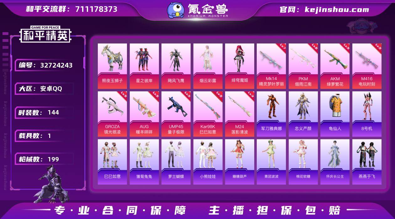 满级地铁安卓 手Q-4粉装-9特效枪-1载具-2粉色飞行器-64912热力值-14王牌印记-144套装-199枪皮 【热门品类】:角色-军刀雅典娜,角色-忠义严颜,套装-龟仙人,角色-8号机,大砍刀-青龙偃月刀,撬棍-龙胆亮银枪 【粉色套装】:粉装-星之彼岸,粉装-飓风飞鹰,角色-烟云彩露,角色-绯穹魔姬 【粉色枪皮等级】:AKM-绿萝繁花(五级),M416-电玩时刻(五级),GROZA-镜光银凌(五级),AUG-暖羊咩咩(五级),UMP45-量子极限(五级),Kar98K-巳巳如意(五级),M24-莲影清波(三级),Mk14-精灵梦叶罗丽(七级),PKM-江南烟雨(六级) 【粉色载具】:照夜玉狮子 【粉色枪皮】:AKM-绿萝繁花,M416-电玩时刻,GROZA-镜光银凌,AUG-暖羊咩咩,UMP45-量子极限,Kar98K-巳巳如意,M24-莲影清波,Mk14-精灵梦叶罗丽,PKM-江南烟雨 【粉色飞行器】:炫彩糖果飞行器,齐天大圣飞行器 【粉色降落伞】:银刃赛罗降落伞,洛神天依降落伞,天之羽翼降落伞,环太平洋降落伞,未来歌姬降落伞,莲影清波降落伞,江南烟雨降落伞,精灵梦叶罗丽降落伞,创世·救赎降落伞,炫彩糖果降落伞 【稀有套装】:套装-龟仙人,套装-巳巳如意,套装-雏菊兔兔,套装-萝兰蝴蝶,套装-小熊娃娃,套装-糖糖葫芦,套装-青团波波,套...