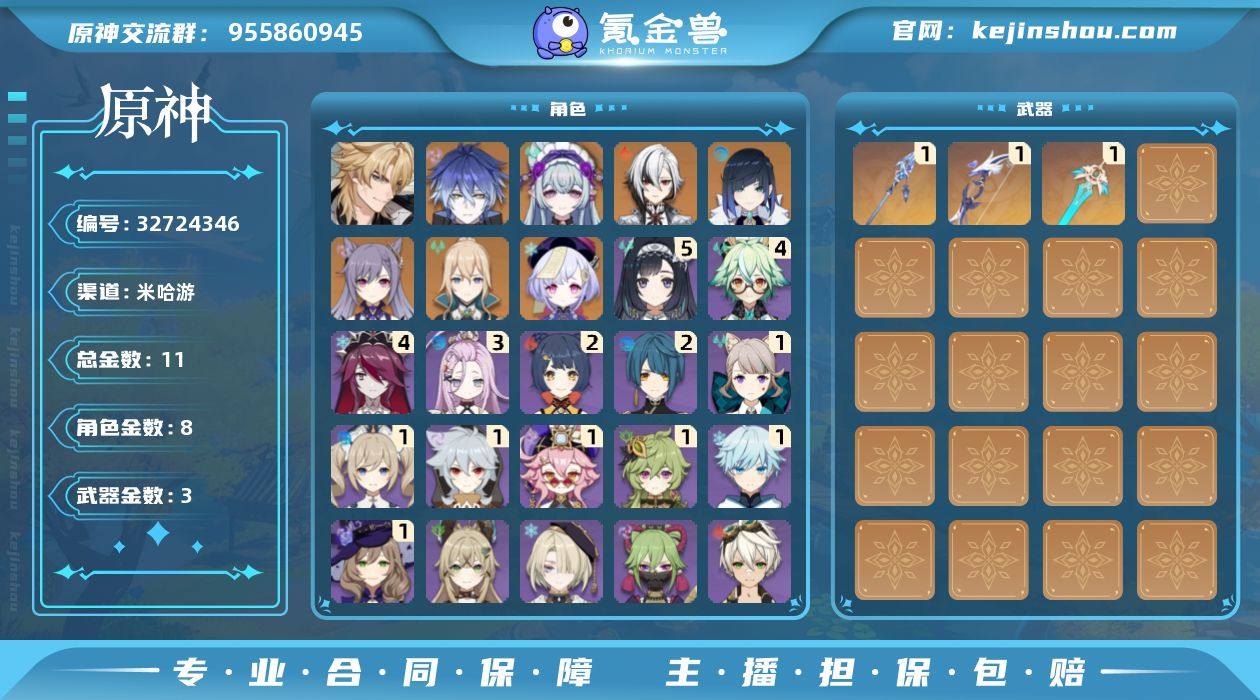 11黄!0+1菲林斯!法尔伽!0+1夜兰!阿蕾奇诺! 冒险等级: 35 0命金色角色: 七七,刻晴,琴,夜兰,阿蕾奇诺,梦见月瑞希,菲林斯,法尔伽 拥有武器: 天空之刃,若水,血染荒城 1精武器: 天空之刃,若水,血染荒城