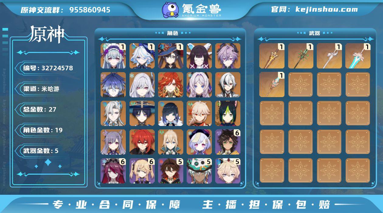 27黄!月感电战舰 菲林斯!少女!1命芙宁娜!杜林!丝柯克!火神!龙王!茜特菈莉!阿蕾奇诺!夜兰! 冒险等级: 58 1命金色角色: 一命莫娜,一命芙宁娜,一命梦见月瑞希 0命金色角色: 迪卢克,枫原万叶,七七,刻晴,琴,夜兰,提纳里,流浪者,那维莱特,阿蕾奇诺,玛薇卡,茜特菈莉,丝柯克,菲林斯,杜林,哥伦比娅 拥有武器: 和璞鸢,天空之傲,风鹰剑,天空之脊,圣显之钥 1精武器: 和璞鸢,天空之傲,风鹰剑,天空之脊,圣显之钥