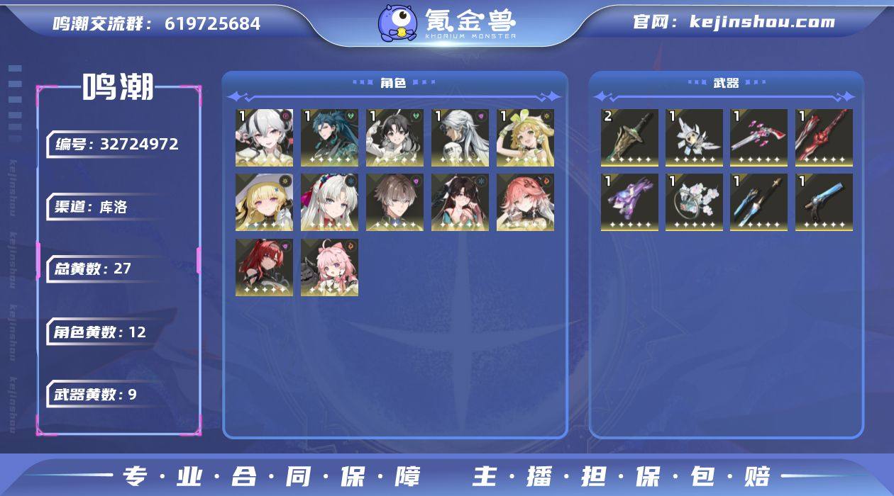 80级/27黄/女主/12个五星角色/9个五星武器未绑定,长离,吟霖,忌炎,维里奈,卡卡罗,鉴心,安可,相里要,椿,折枝,珂莱塔,菲比,苍鳞千嶂,千古洑流,停驻之烟,裁春,诸方玄枢,琼枝冰绡,死与舞,和光回唱,1命忌炎,1命维里奈,1命卡卡罗,1命鉴心,1命椿,0命长离,0命吟霖,0命安可,0命相里要,0命折枝,0命珂莱塔,0命菲比,精2苍鳞千嶂,精1千古洑流,精1停驻之烟,精1裁春,精1诸方玄枢,精1琼枝冰绡,精1死与舞,精1和光回唱