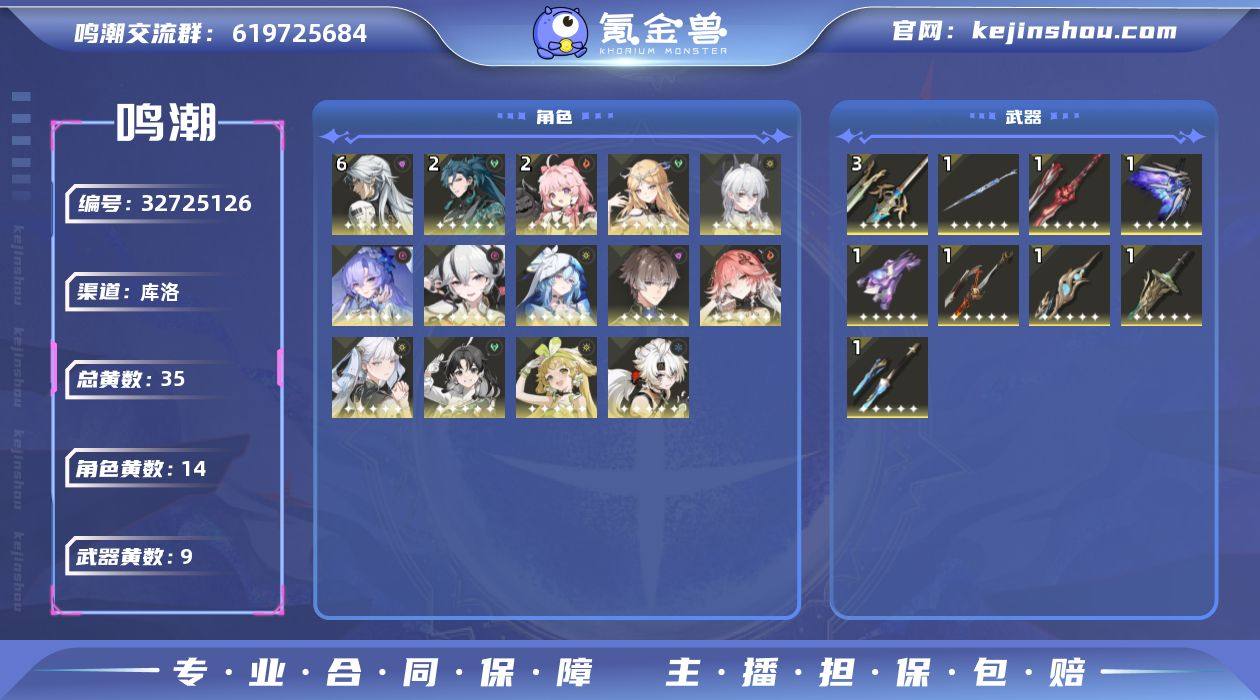 80级/35黄/女主/14个五星角色/9个五星武器未绑定,卡提希娅,赞妮,坎特蕾拉,椿,守岸人,相里要,长离,今汐,忌炎,维里奈,鉴心,卡卡罗,安可,凌阳,不屈命定之冠,血誓盟约,裁春,星序协响,诸方玄枢,赫奕流明,时和岁稔,苍鳞千嶂,千古洑流,满命卡卡罗,2命忌炎,2命安可,0命卡提希娅,0命赞妮,0命坎特蕾拉,0命椿,0命守岸人,0命相里要,0命长离,0命今汐,0命维里奈,0命鉴心,0命凌阳,精3血誓盟约,精1不屈命定之冠,精1裁春,精1星序协响,精1诸方玄枢,精1赫奕流明,精1时和岁稔,精1苍鳞千嶂,精1千古洑流