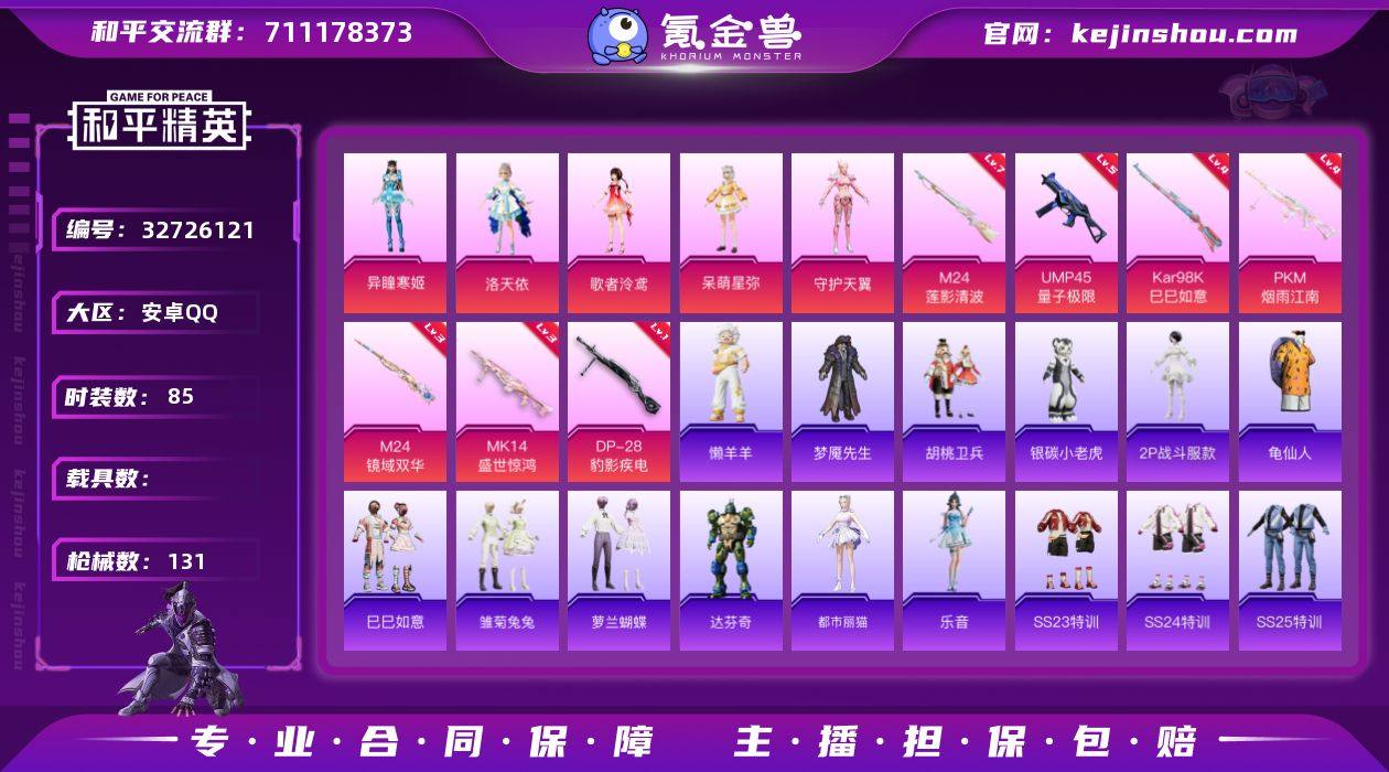 【kyhp883】安卓 手Q-5粉装-7特效枪-0载具-3粉色飞行器-43785热力值-4王牌印记-85套装-131枪皮 【热门品类】:角色-2P战斗服款,套装-龟仙人 【粉色套装】:角色-洛天依,角色-歌者泠鸢,角色-呆萌星弥,角色-守护天翼,角色-异瞳寒姬 【粉色枪皮等级】:UMP45-量子极限(五级),Kar98K-巳巳如意(四级),M24-莲影清波(七级),M24-镜域双华(三级),Mk14-盛世惊鸿(三级),DP-28-豹影疾电(一级),PKM-江南烟雨(四级) 【粉色枪皮】:UMP45-量子极限,Kar98K-巳巳如意,M24-莲影清波,M24-镜域双华,Mk14-盛世惊鸿,DP-28-豹影疾电,PKM-江南烟雨 【粉色飞行器】:镜域双华-灵镜之阶,龙翔九天飞行器,深渊漩涡飞行器 【粉色降落伞】:天之羽翼降落伞,第五大道降落伞,白勺歌姬降落伞,熔岩统帅降落伞,圣堂之誓降落伞,镜域双华降落伞,江南烟雨降落伞,巴啦啦小魔仙降落伞,精灵梦叶罗丽降落伞,墨龙九天降落伞,创世·救赎降落伞,守护天翼降落伞,金丰海韵降落伞,盛世惊鸿降落伞 【稀有套装】:套装-龟仙人,套装-巳巳如意,套装-雏菊兔兔,套装-萝兰蝴蝶,角色-达芬奇,角色-都市丽猫,角色-乐音,玩偶服-懒羊羊 【稀有枪皮】:AKM-2P战斗服款,AKM-江南烟雨,AKM-胡桃卫兵,A...