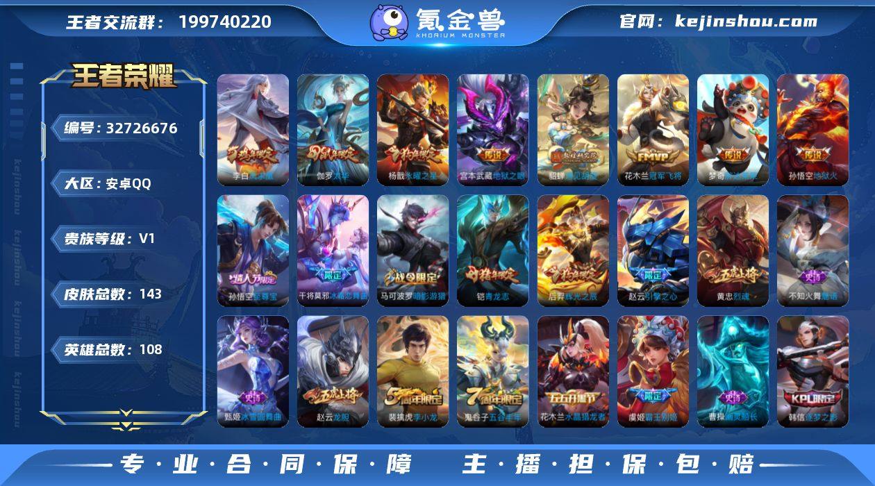 【YX1320】【凤求凰/永曜之星/龙胆/遇见胡璇/太华/至尊宝】143皮肤8传说/遇见胡旋/太华/冠军飞将/胖达荣荣/永曜之星/凤求凰/地狱之眼/地狱火【限定皮肤】:白起狰,狄仁杰阴阳师,虞姬凯尔特女王,赵云皇家上将,赵云引擎之心,赵云龙胆,孙尚香蔷薇恋人,鲁班七号狮舞东方,庄周蜃楼王,庄周云端筑梦师,庄周高山流水,阿轲迷踪丽影,钟无艳王者之锤,孙膑妖精王,扁鹊炼金王,芈月重明,夏侯惇朔风刀,甄姬游园惊梦,曹操烛龙,典韦穷奇,马可波罗暗影游猎,狄仁杰魔术师,狄仁杰万华元夜,项羽海滩派对,老夫子醍醐杖,貂蝉遇见胡旋,程咬金演武夺筹,刘邦夺宝奇兵,韩信逐梦之影,亚瑟狮心王,孙悟空至尊宝,牛魔御旌,后羿辉光之辰,李元芳银河之约,李元芳云中旅人,虞姬霸王别姬,钟馗神迹守卫,钟馗驱傩正仪,杨戬永曜之星,干将莫邪冰霜恋舞曲,太乙真人饕餮,鬼谷子原初探秘者,鬼谷子五谷丰年,黄忠烈魂,铠青龙志,苏烈千军破阵,弈星混沌棋,沈梦溪星空之诺,明世隐疑决卦,裴擒虎李小龙,狂铁御狮,米莱狄御霄,伽罗太华,盾山御銮,猪八戒西部大镖客,上官婉儿梁祝,鲁班大师探海日志,桑启海盐诗旅,张良古海寻踪,鬼谷子天穹祈灯【年限皮肤】:李白凤求凰,...