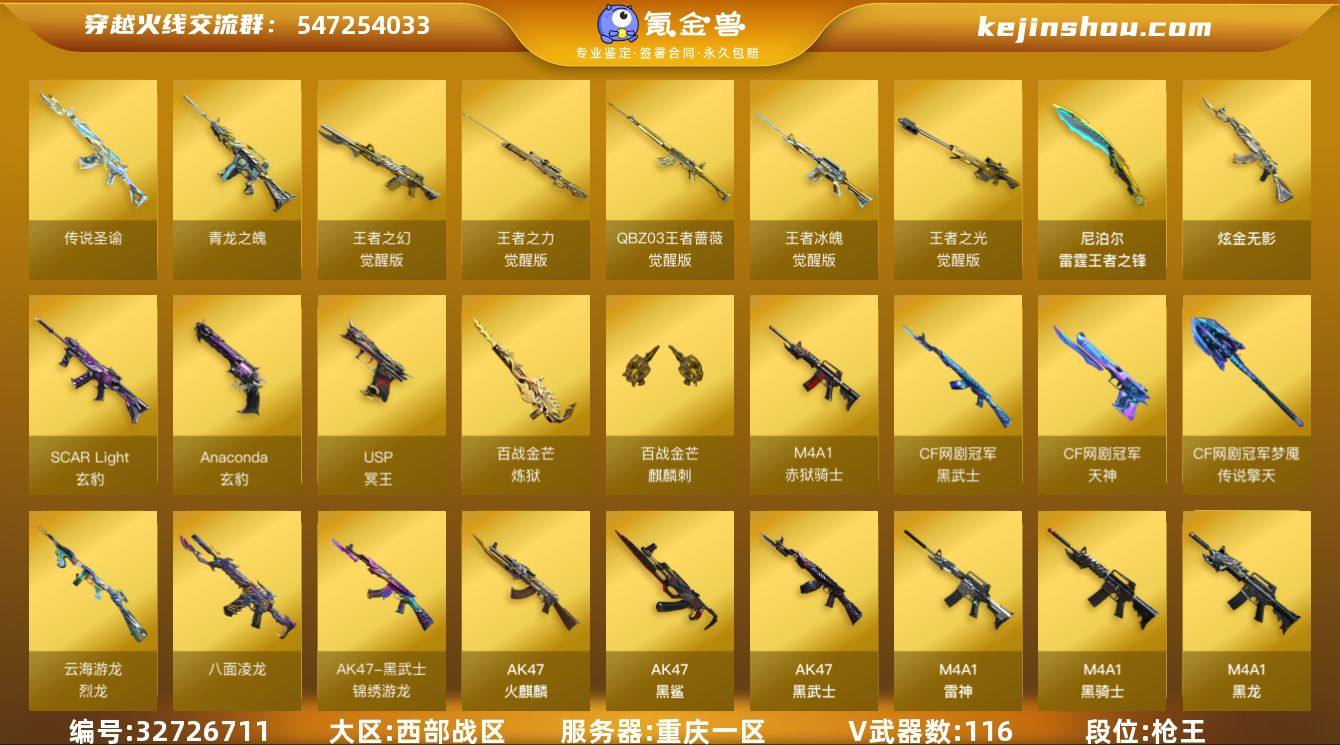 【ky5219】重庆一区-121V-18王者-1炫金 【传说武器】:传说圣谕 【传说角色】:传说星骇 【热门武器】:传说圣谕,HK417-朱雀,M200-幻神,M200-竞技荣光,八面凌龙,死亡之眼,青龙之魄,荣耀世冠-火麒麟,荣耀世冠-雷神*2,白虎-电玩蓝兔,Kar98K-星神,Cat-刀锋,牛牛-AK47,M4A1-黑骑士*3,汤姆逊-烈龙*5,COP-白鲨,USP-雷暴,沙鹰-修罗*3,荣耀世冠-龙啸*2 【王者炫金武器】:青龙之魄,雷霆王者之锋,炫金无影 【音效卡】:修罗-云海游龙音效卡,M4A1-黑龙音效卡,M4A1-黑骑士音效卡,Barrett-极光音效卡,AWM-裁决音效卡,Barrett-碧霄极光音效卡,炼狱-百战金芒-庆典舞曲音效卡 【皮肤】:幻神-丹凤,幻神-电竞之星 皮肤,白虎-大汉风骨,金色蔷薇-电竞之星 皮肤,裁决-胜者为王 皮肤,星神-璀璨皮肤,星神-黯钢战甲 皮肤,雷神-暗月,雷神-R.LGD-CFPLS18冠军,M4A1-再燃火线,雷神-神秘按键 皮肤,毁灭-黑曼巴 皮肤,毁灭-秦师 皮肤,毁灭-英雄计划 皮肤,黑龙-能量核心,黑骑士-暗月,黑骑士-AG-S4冠军典藏,AWM-天龙-传奇白鲨,极光-高能霹雳 皮肤,修罗-能量核心,修罗-冠军之魂,屠龙-春桃 皮肤,轻型军用手斧-再燃火线 【角色】:电竞教官-云悠悠,玄豹,荆棘...