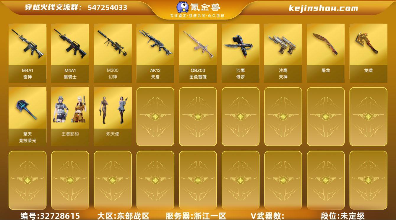 5949/东部/浙江一区/可排位/段位未定段/Lv.99 上将6/45V/【幻神三件套】/幻神/幻神音效卡/幻神荣耀世冠白鲨/幻神黄忠/星神/【QBZ三件套】/QBZ金色蔷薇/QBZ金色蔷薇音效卡/金色蔷薇破浪逐光皮肤/柯尔特荣耀世冠EP/王者之怒/烈火动感闪耀套/雷神/黑骑士/【音效卡】/黑骑士音效卡/碧霄极光音效卡/【枪皮】/火麒麟百城/雷神荣耀之魄/毁灭黑大圣皮肤/【四防】/王者影豹/王者炽天使/【角色】/奇洋探员/乔伊教练/云海玲珑/0号玩家/【小人枪】/M4A1雷神精英刀锋/【道具】/永久烟雾头/护目镜/超级背包/各种戒指/各种光效/各种玩偶/永久AC/永久雷包/细节看图/【此账号未被封过十年】