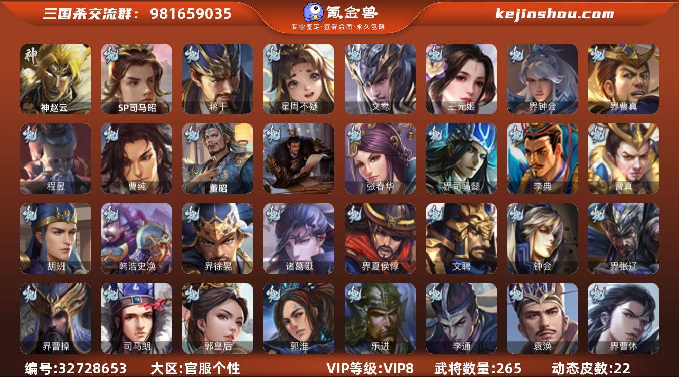【4477】官阶:骠骑将军;VIP等级:VIP8;史诗武将数量:21;动态皮肤数量:22;武将总数:265;史诗宝珠数量:5;将魂数量:340;神将:1;魏国史诗武将:17;蜀国史诗武将:6;吴国史诗武将:3;群史诗武将:4