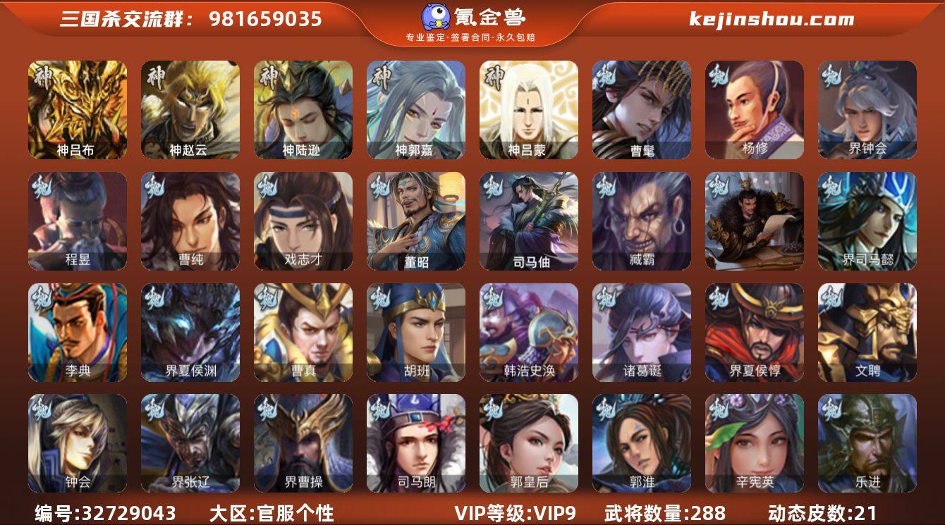官阶:骠骑将军;VIP等级:VIP9;史诗武将数量:31;动态皮肤数量:21;武将总数:288;史诗宝珠数量:5;将魂数量:7566;神将:4;魏国史诗武将:16;蜀国史诗武将:5;吴国史诗武将:5;群史诗武将:12 神吕布,神赵云,神陆逊,神郭嘉,曹髦,杨修,界钟会,曹纯,戏志才,程昱,谋赵云,诸葛瞻,沙摩柯,谯周,谋关羽,张奋,周处,留赞,界徐盛,势太史慈,十常侍,星甘宁,麹义,沮授,界左慈,界李儒,谋张角,许攸,星董卓,兀突骨,司马昭,神吕蒙,SP关羽,乐进,曹昂,诸葛诞,朱灵,文聘,SP姜维,钟会,曹冲,郭淮,满宠,界王异,界曹操,界司马懿,界夏侯惇,界张辽,界许褚,李典,曹真,韩浩史涣,陈群,曹叡,钟繇,司马朗,李通,郭皇后,辛宪英,吕虔,鲁芝,杜畿,界邓艾,界曹植,界满宠,界郭淮,卞夫人,蔡贞姬,袁涣,崔琰,阮慧,谋于禁,胡班,司马伷,界夏侯渊,臧霸,唐咨,董昭,势陈到,SP孙尚香,关银屏,夏侯霸,马良,关兴张苞,廖化,界马岱,关平,简雍,刘封,界法正,界关兴张苞,界刘备,界关羽,界张飞,界马超,SP徐庶,吴懿,周仓,张松,夏侯氏,糜竺,马忠,李严,严颜,邓芝,傅肜,界简雍,陈震,费祎,宗预,刘巴,彭羕,谋庞统,界张嶷,谋张飞,吴班,霍峻,诸葛果,蒋琬费祎,甘夫人,凌操,大乔小乔,诸葛瑾,孙鲁育,程普,韩当,潘璋马忠,虞翻,朱然,界甘宁,界黄盖,界...